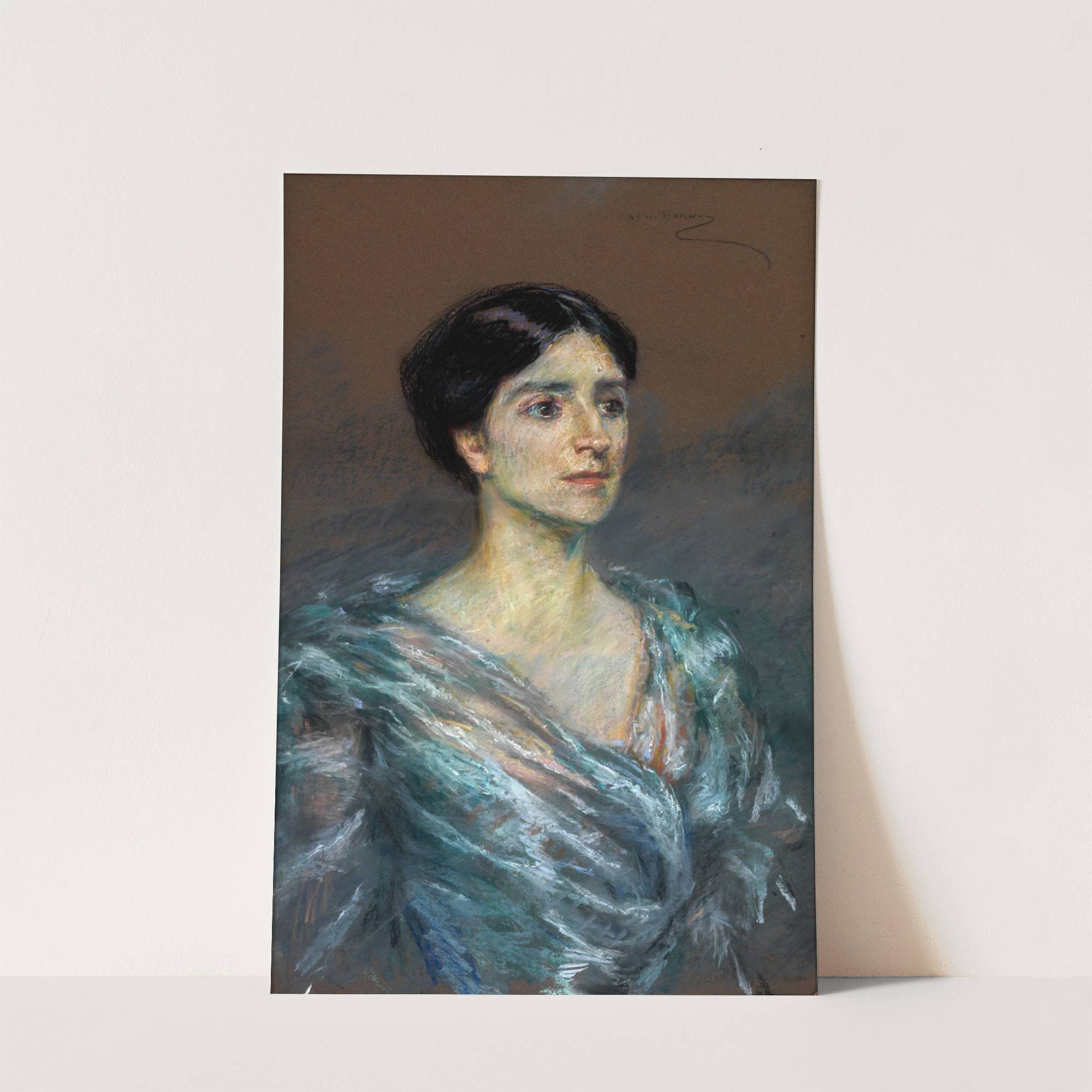 This artistic print features a portrait of a young woman painted by Marianne Girard, as signed by the artist in her distinctive style. The subject has fair skin and dark brown hair elegantly styled in an updo, with soft, delicate...
