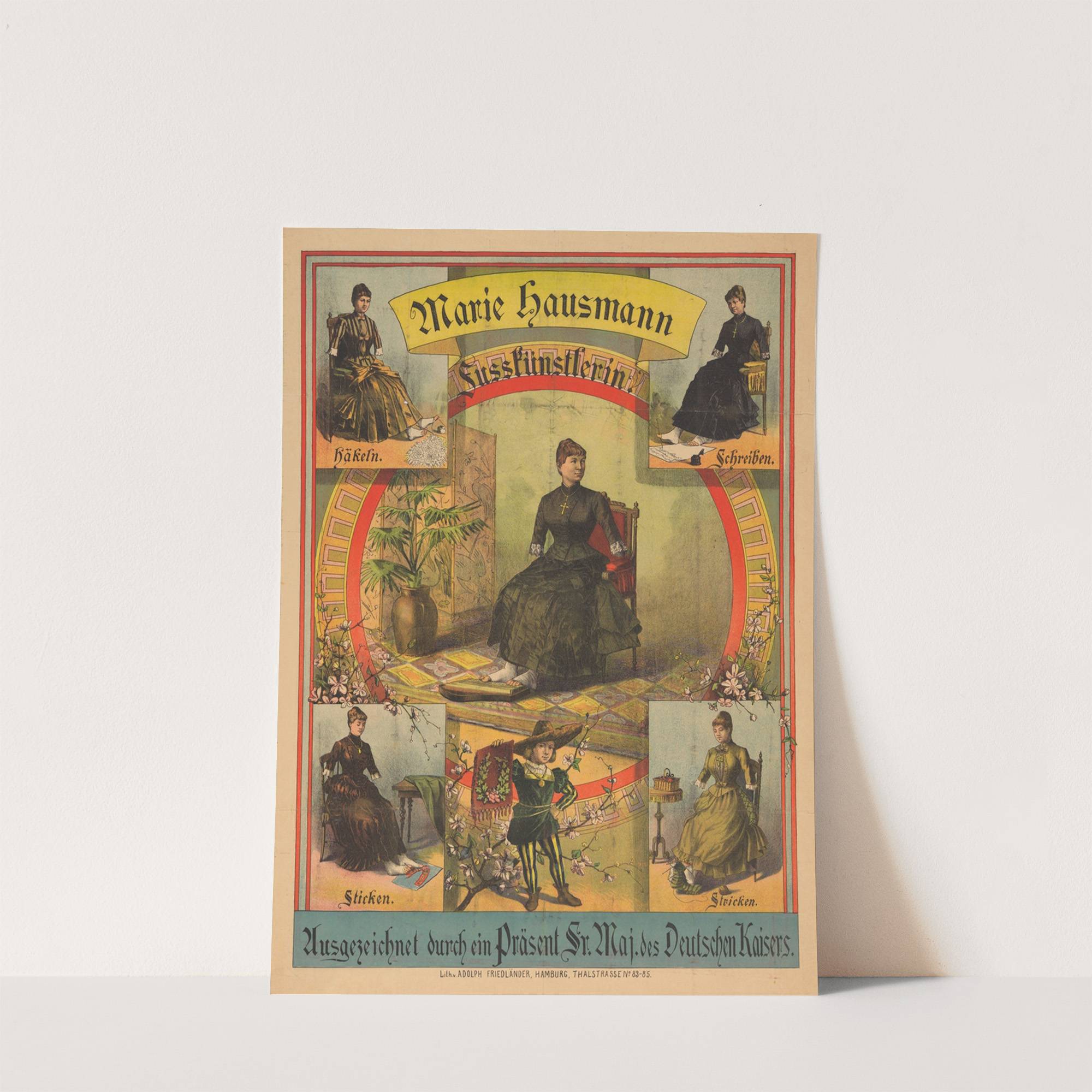 This vibrant print features "Fünf Künstlerinnen," a work by Marie Hausmann showcasing five female artists from different periods of history, each in distinctive attire. The central figure is seated, dressed in an elaborate Victorian-era dress with dark green hues and...