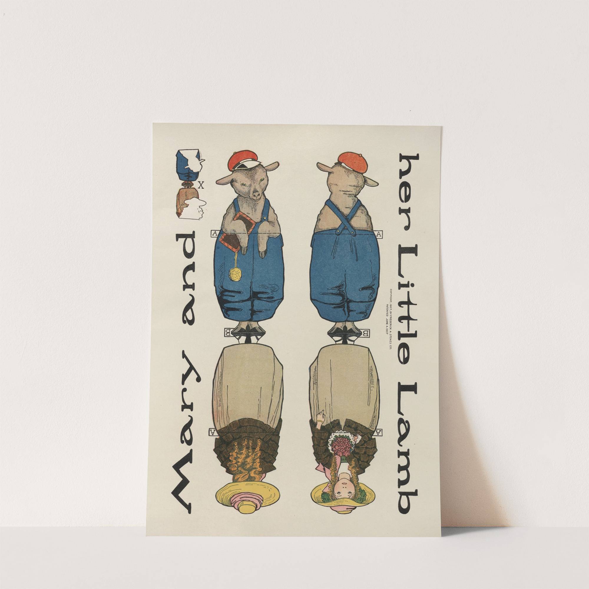 This charming digital illustration titled "Mary and Her Little Lamb" features two sheep characters in blue overalls and red caps, depicted both standing upright and upside-down with their heads hanging down. The standing sheep on the left has a calm...