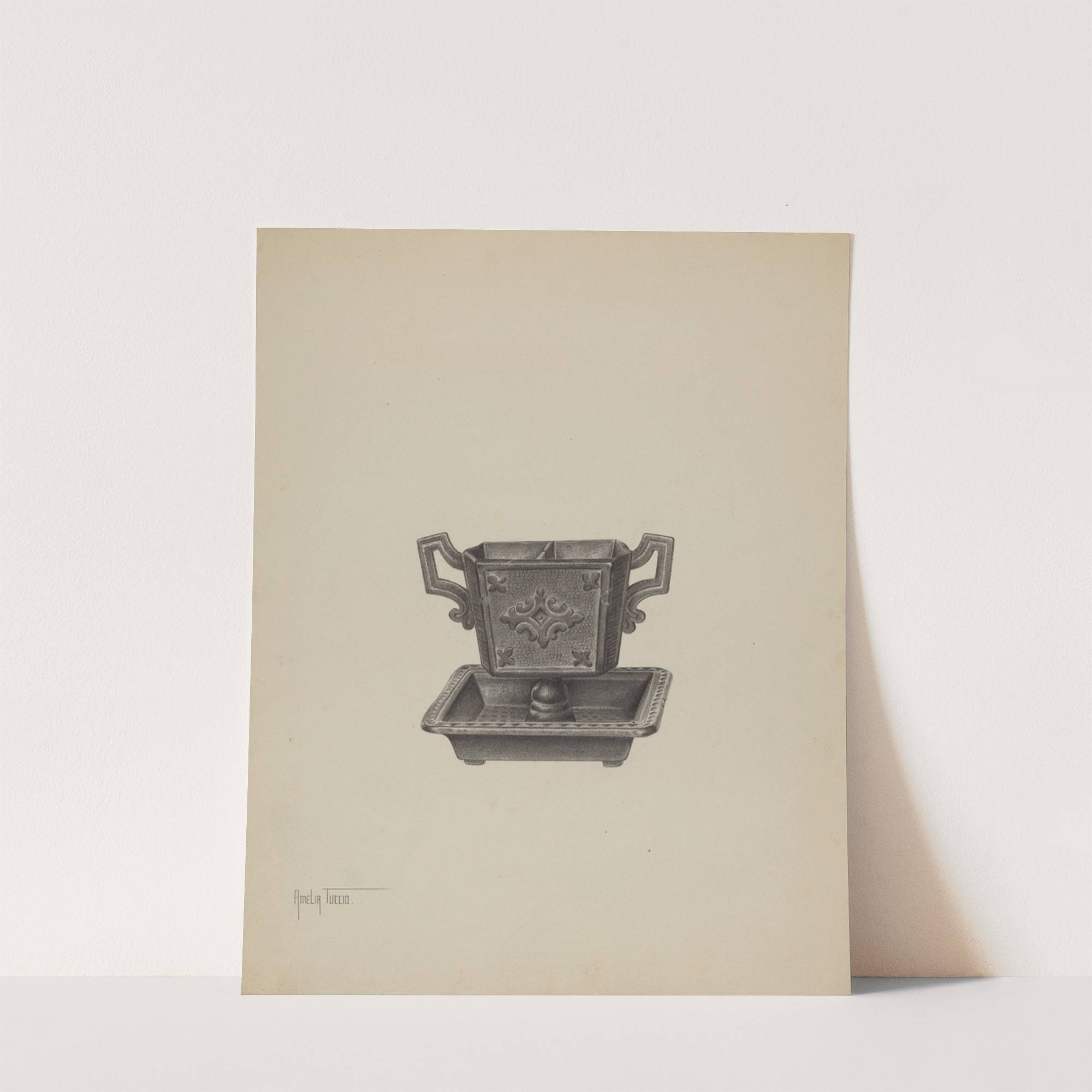 This artistic print features "Match Safe" by Amelia Tuccio, showcasing a meticulously detailed illustration of an ornate match safe. The design is rendered in a monochromatic palette of dark charcoal black against a clean, white background. The match safe has...