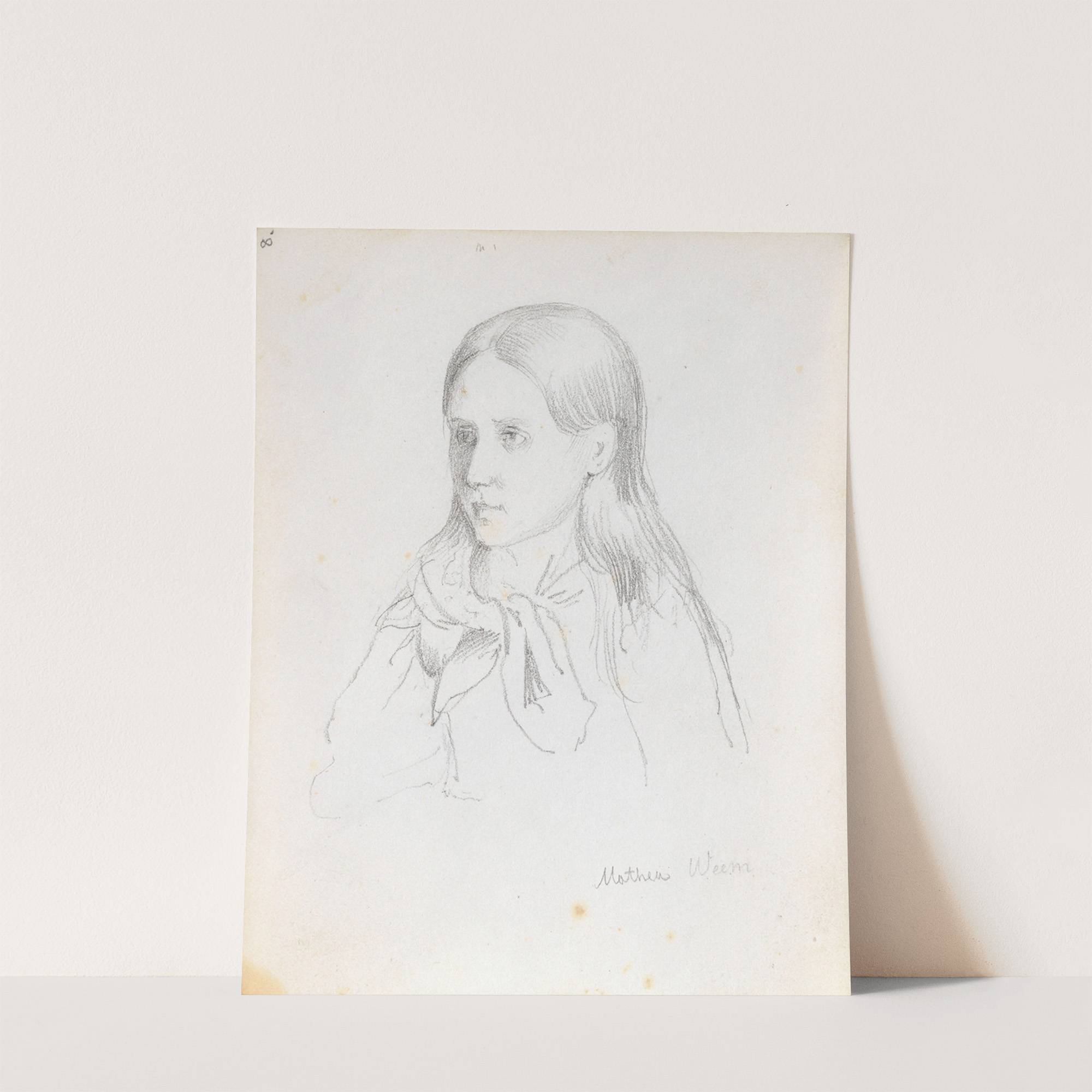 This striking pencil drawing by artist Mathea Weem, created in the style of Adolph Tidemand from 1848, presents a captivating portrait of a young woman with delicate, graceful features. Her long, straight hair cascades softly over her shoulders, while her...