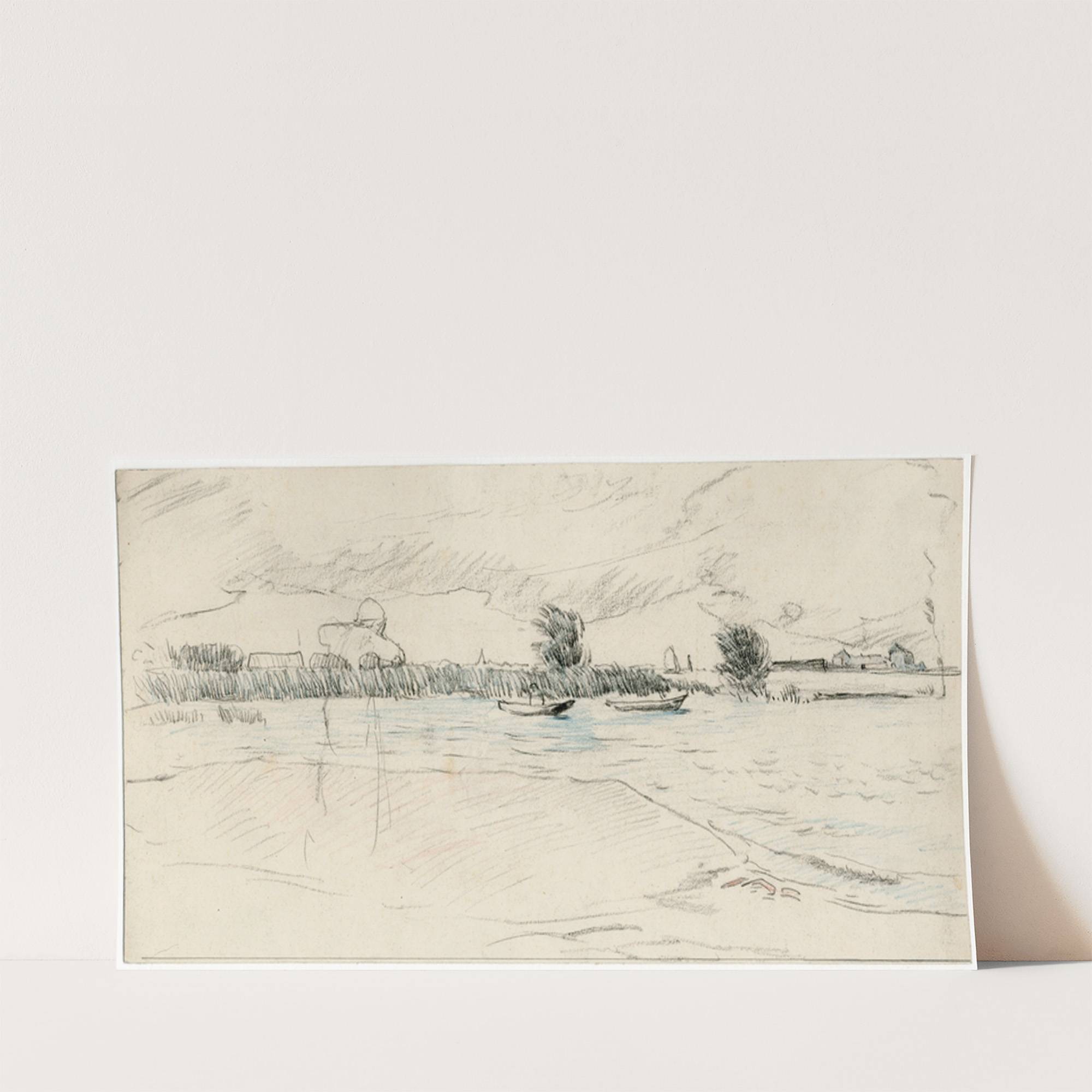 This monochromatic artwork by Adolf Le Comte features a serene lakeside scene titled "Meer met enkele roeibootjes." The piece is rendered in delicate pencil strokes, giving it an ethereal and tranquil appearance. The foreground showcases calm water with subtle ripples,...