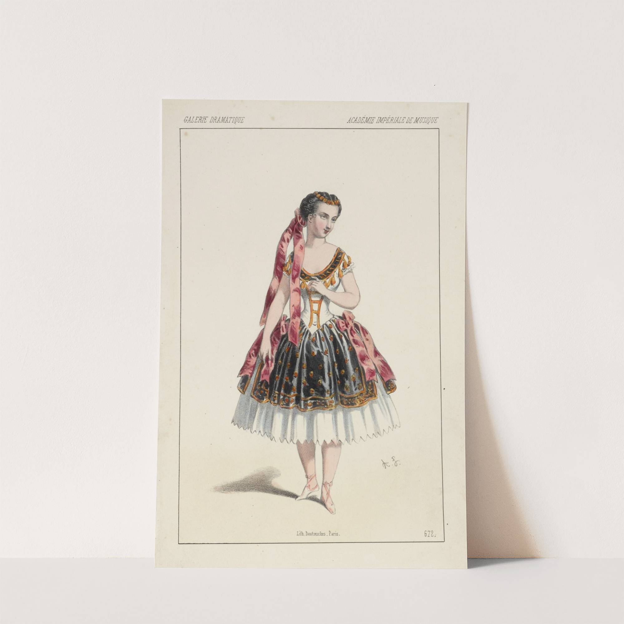 Introducing "Bouquière de la Seconde Acte," a stunning art print by Melle Rosati from the mid-19th century. This exquisite illustration beautifully captures a young woman in an elaborate, Victorian-style ballet costume. The central figure is adorned in a richly detailed...