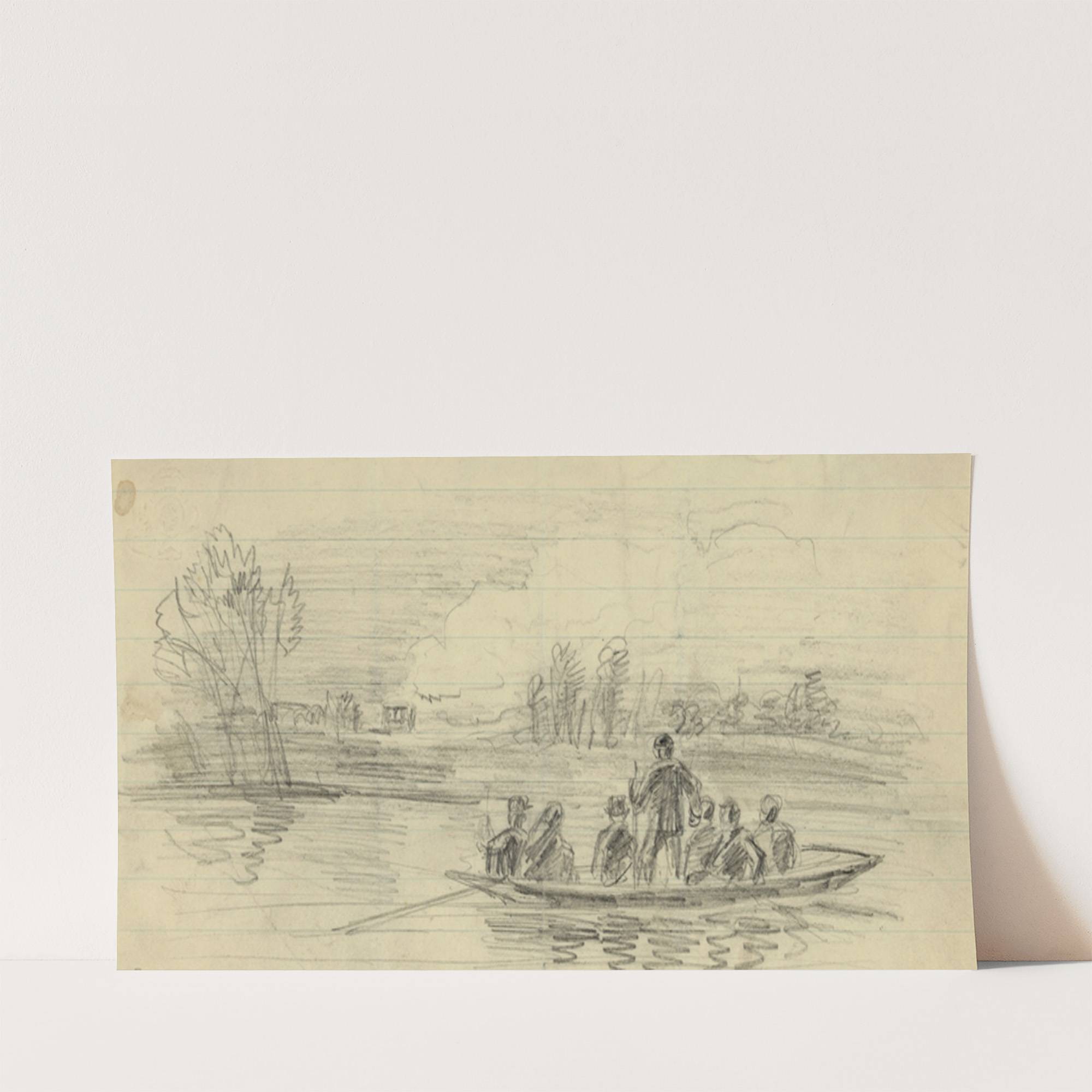 This exquisite black-and-white pencil sketch captures a serene lakeside scene titled "Men in Boat" by renowned artist Alfred Rudolph Waud. The artwork features a small rowboat carrying eight men, each depicted with attention to detail through Waud's deft use of...