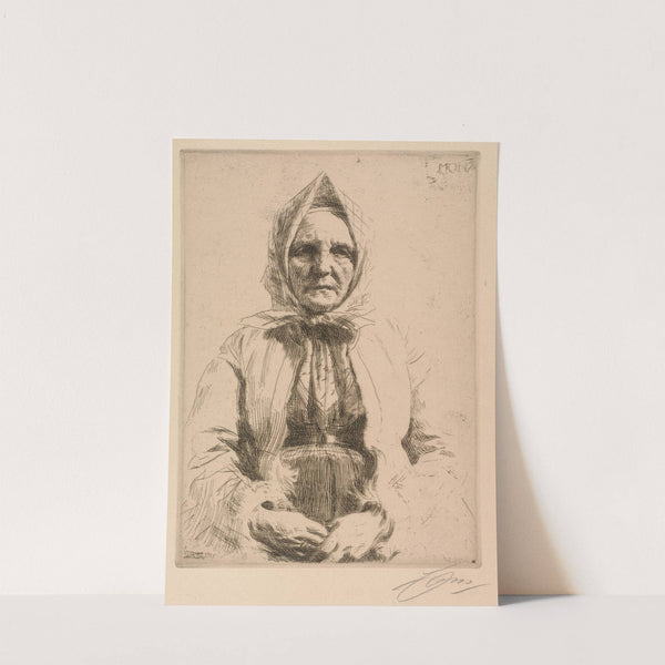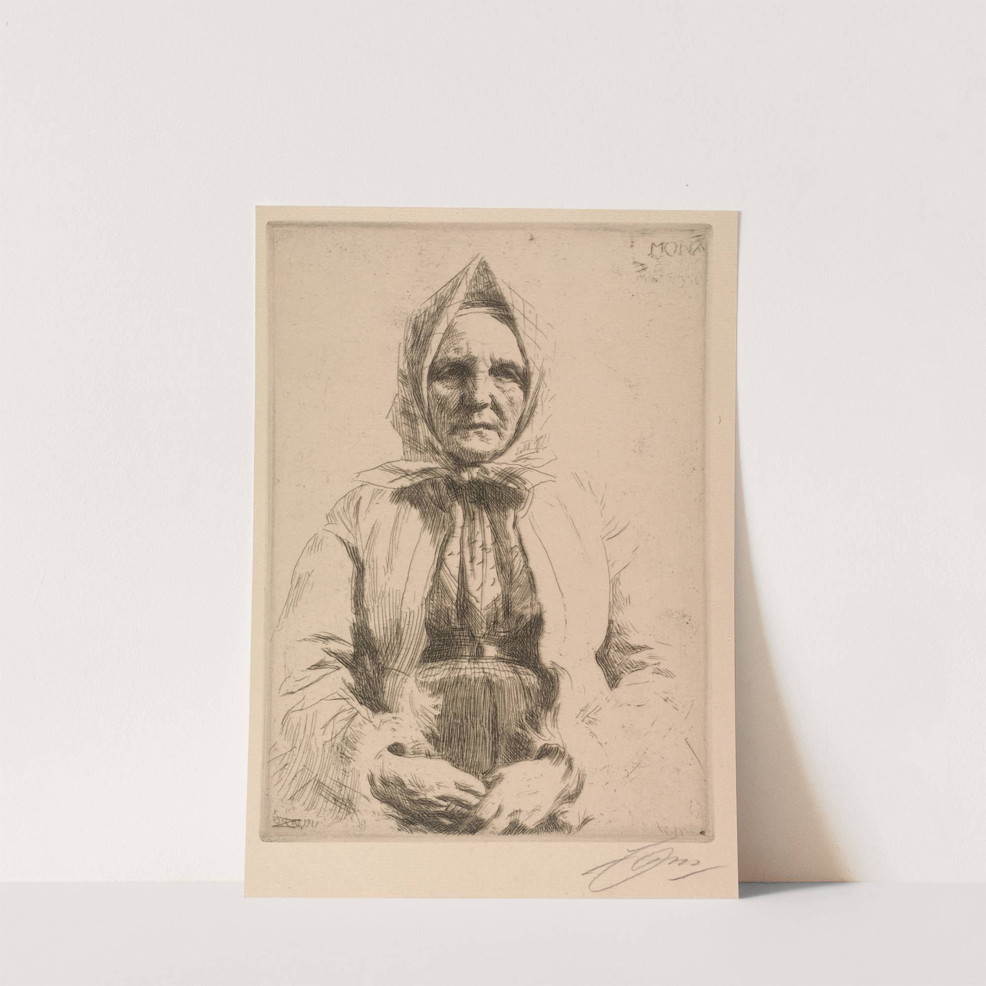 This artwork is a striking black-and-white etching titled "Mona" by the renowned artist Anders Zorn. The piece features a dignified elderly woman with a solemn expression, seated in a somewhat contemplative posture. She wears a traditional head covering that frames...