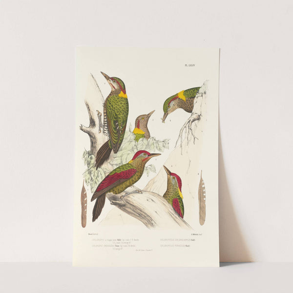 This art print features "Monographie des picidées pl13" by Alfred Malherbe, showcasing a detailed illustration of five different bird species in vibrant hues. The birds are meticulously depicted with striking red, green, and yellow plumage, each bird displaying unique patterns...