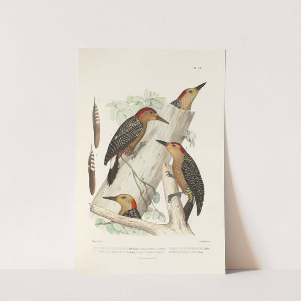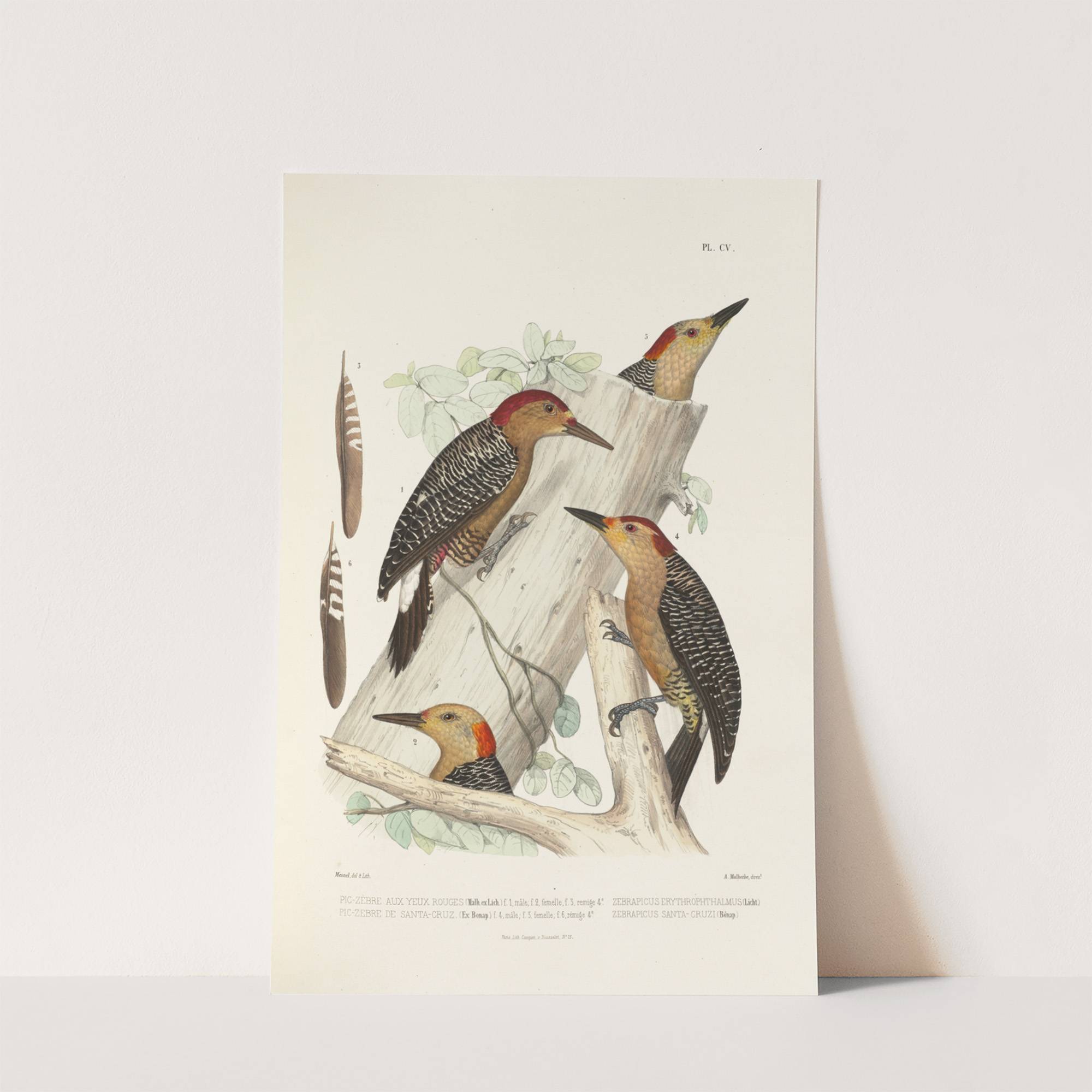 This stunning art print features "Monographie des picidées pl34" by Alfred Malherbe, beautifully capturing the essence of woodpeckers in detailed, naturalistic style. The composition showcases four vividly colored woodpeckers perched on a weathered, textured tree trunk. The birds are depicted...