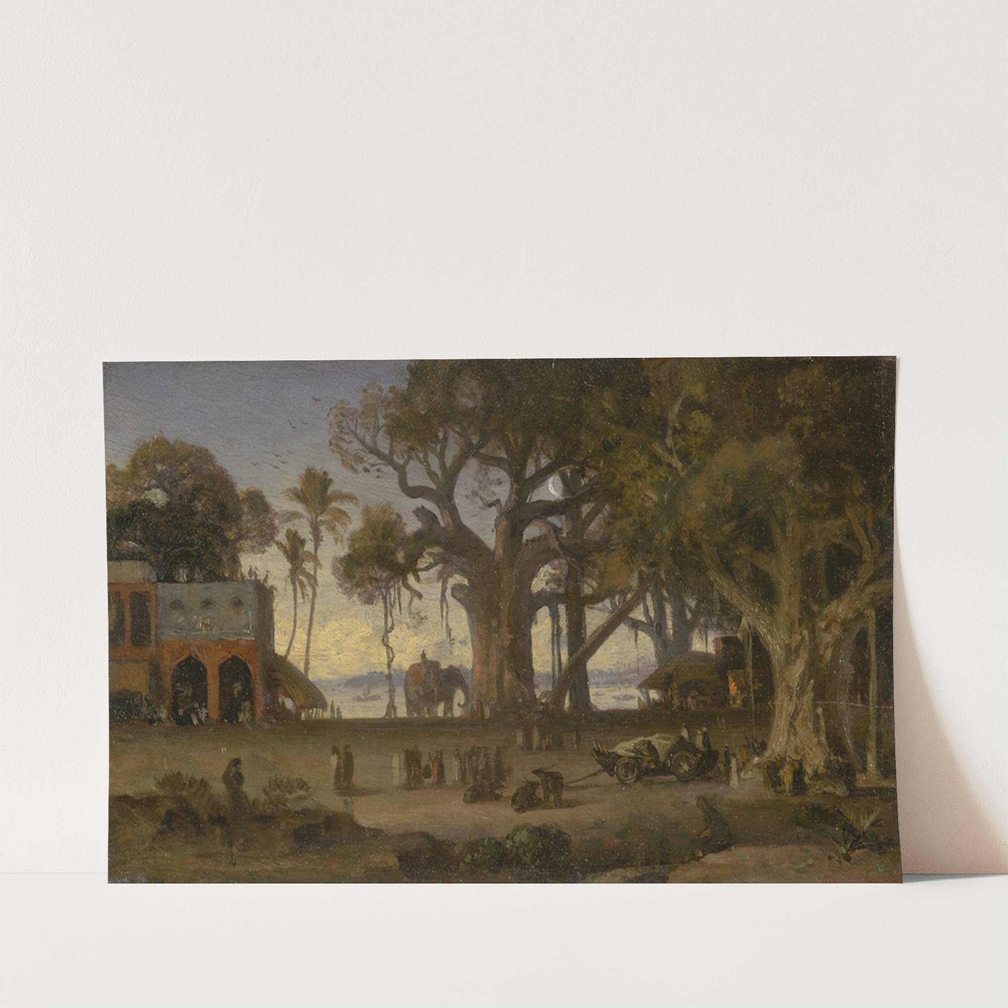 Moonlit Scene of Indian Figures and Elephants among Banyan Trees, Upper India (probably Lucknow) by Auguste Borget - Wall Art Print