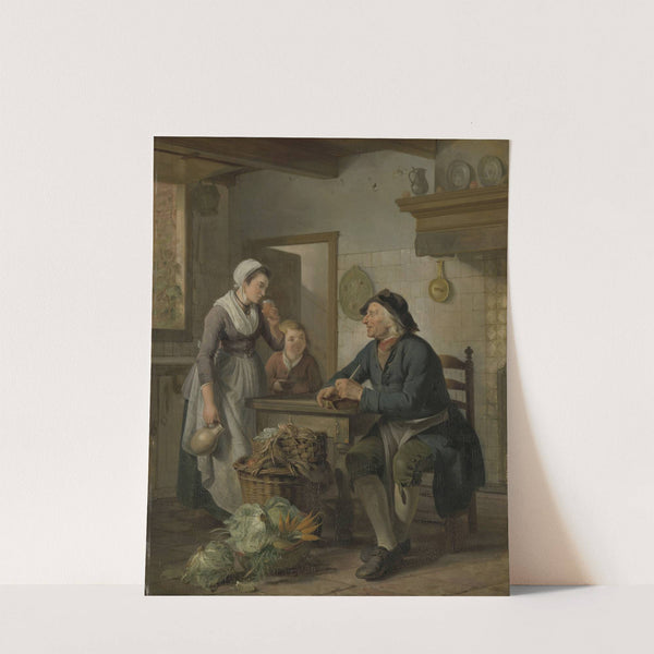 This exquisite print, titled "Morning Visit" by Adriaan de Lelie, captures a tender rural scene with remarkable detail and realism. Set in a quaint kitchen, the composition features three figures: a young woman, an older man, and a small child.The...