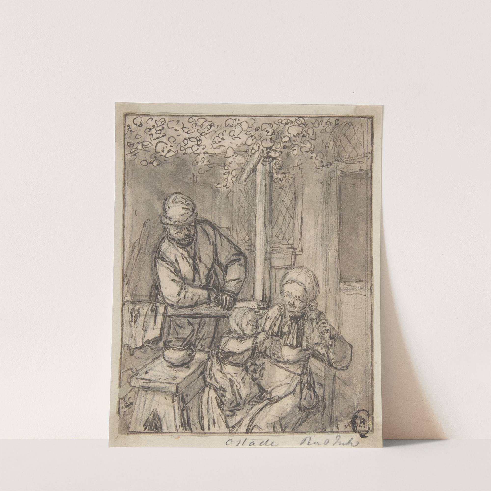 This elegant print features "Mother and Child with a Doll" by the renowned artist Adriaen van Ostade. Rendered in delicate monochromatic ink, it showcases a tender domestic scene from the 17th century. The mother, dressed in period-appropriate clothing, bends slightly...