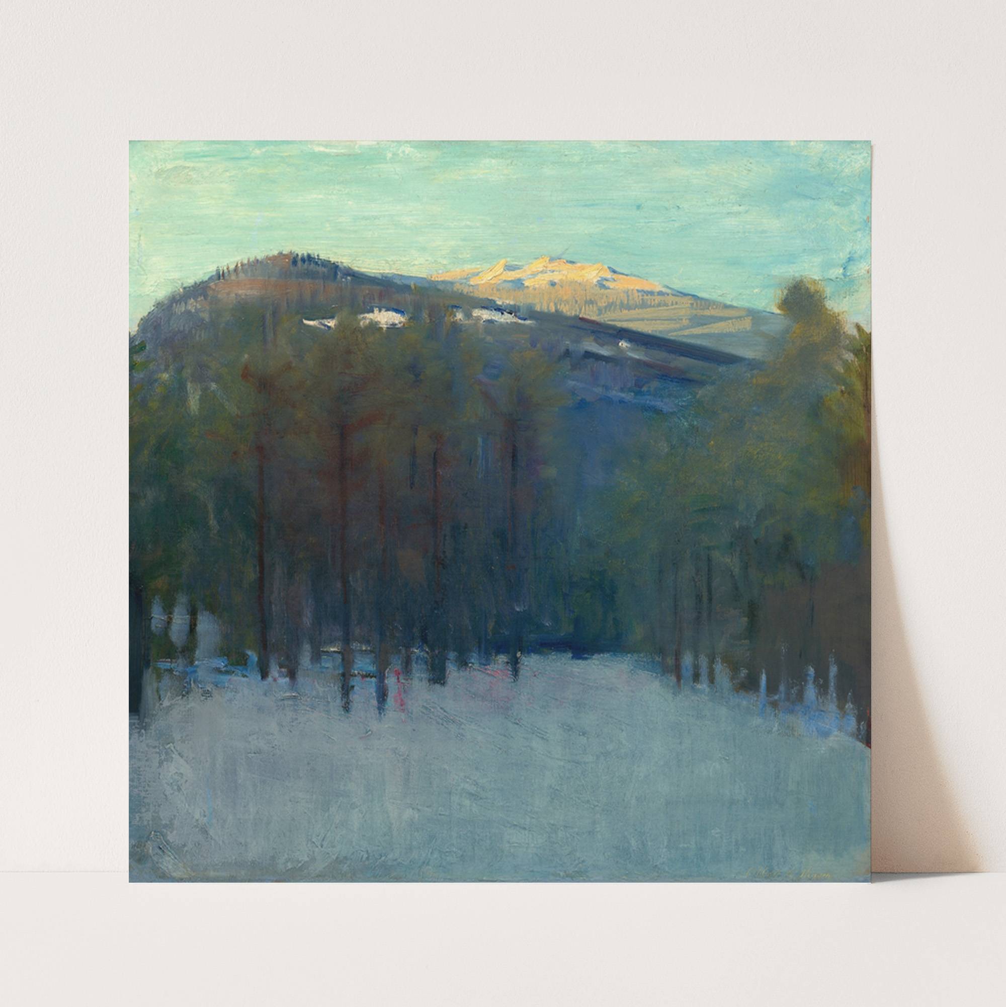 This captivating art print features "Mount Monadnock (1911)" by Abbott Handerson Thayer. The painting showcases a serene forest landscape bathed in the gentle light of either sunrise or sunset. Dark, tall pine trees populate the mid-ground, their deep green and...