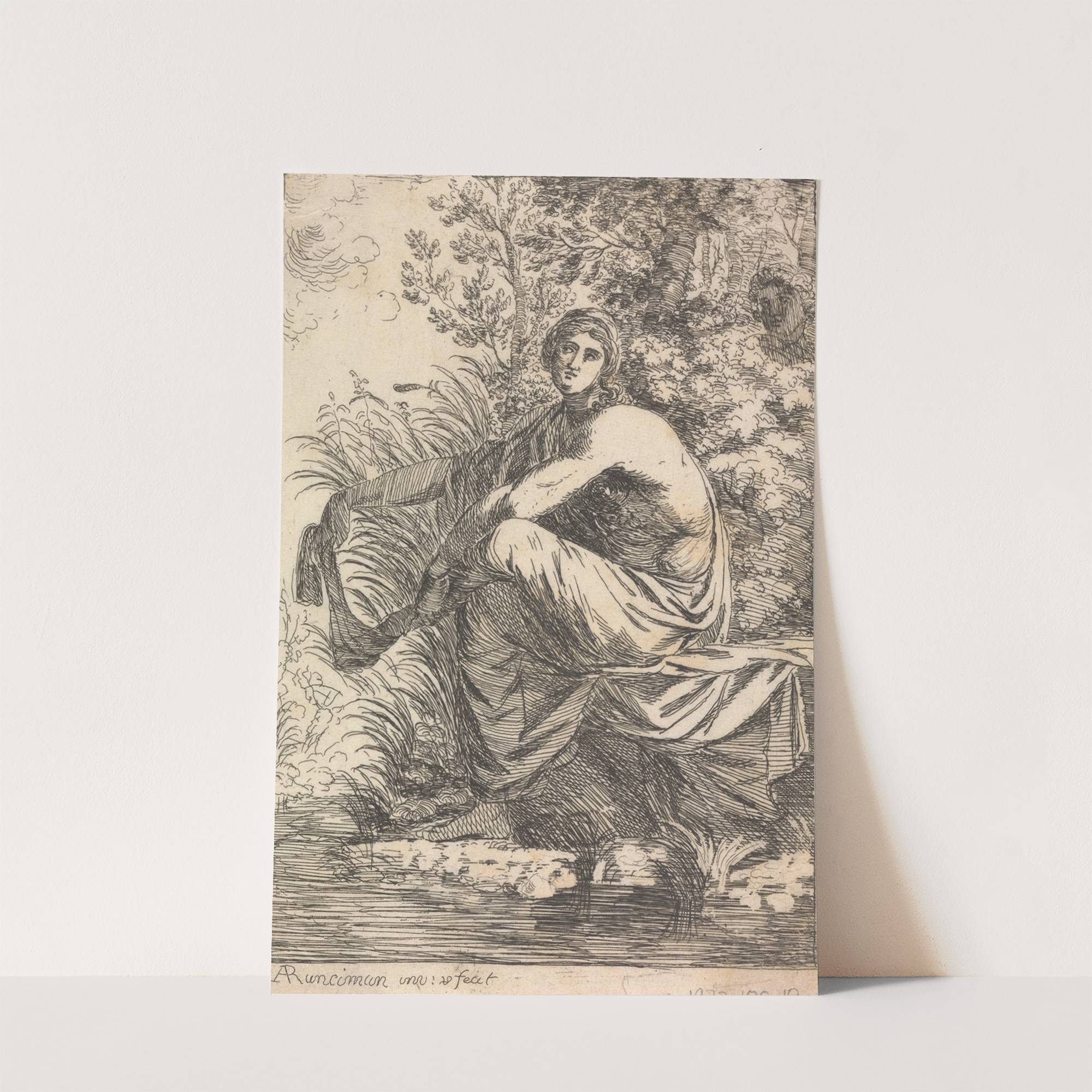 This art print features "Musidora" by Alexander Runciman, executed in a detailed black-and-white etching style. The subject is a young woman with a serene expression, depicted sitting among lush foliage. Her figure is gracefully draped in classical attire that flows...