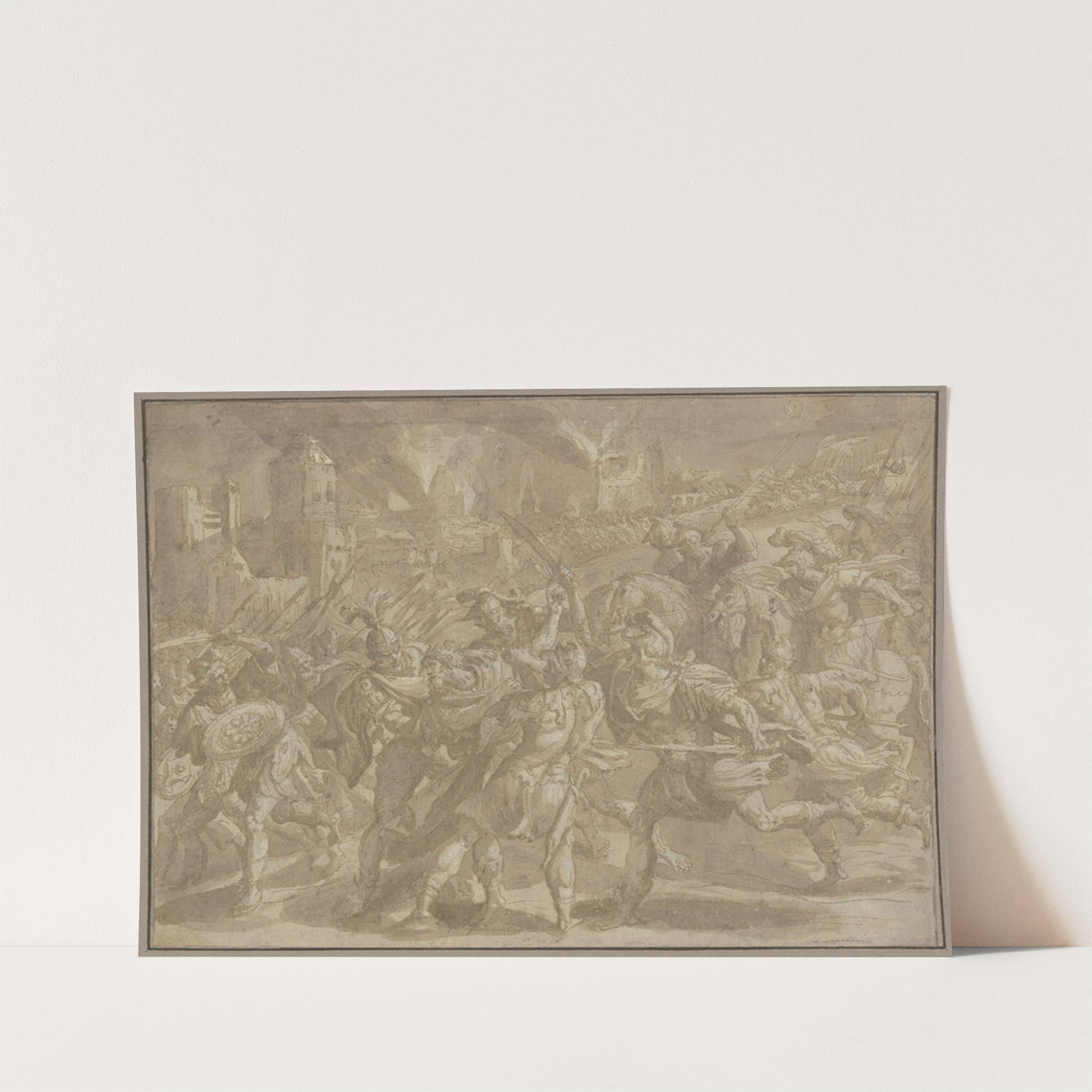 Nächtliches Schlachtgeschehen vor den Toren einer belagerten Stadt in Flammen by Maerten De Vos - Wall Art Print