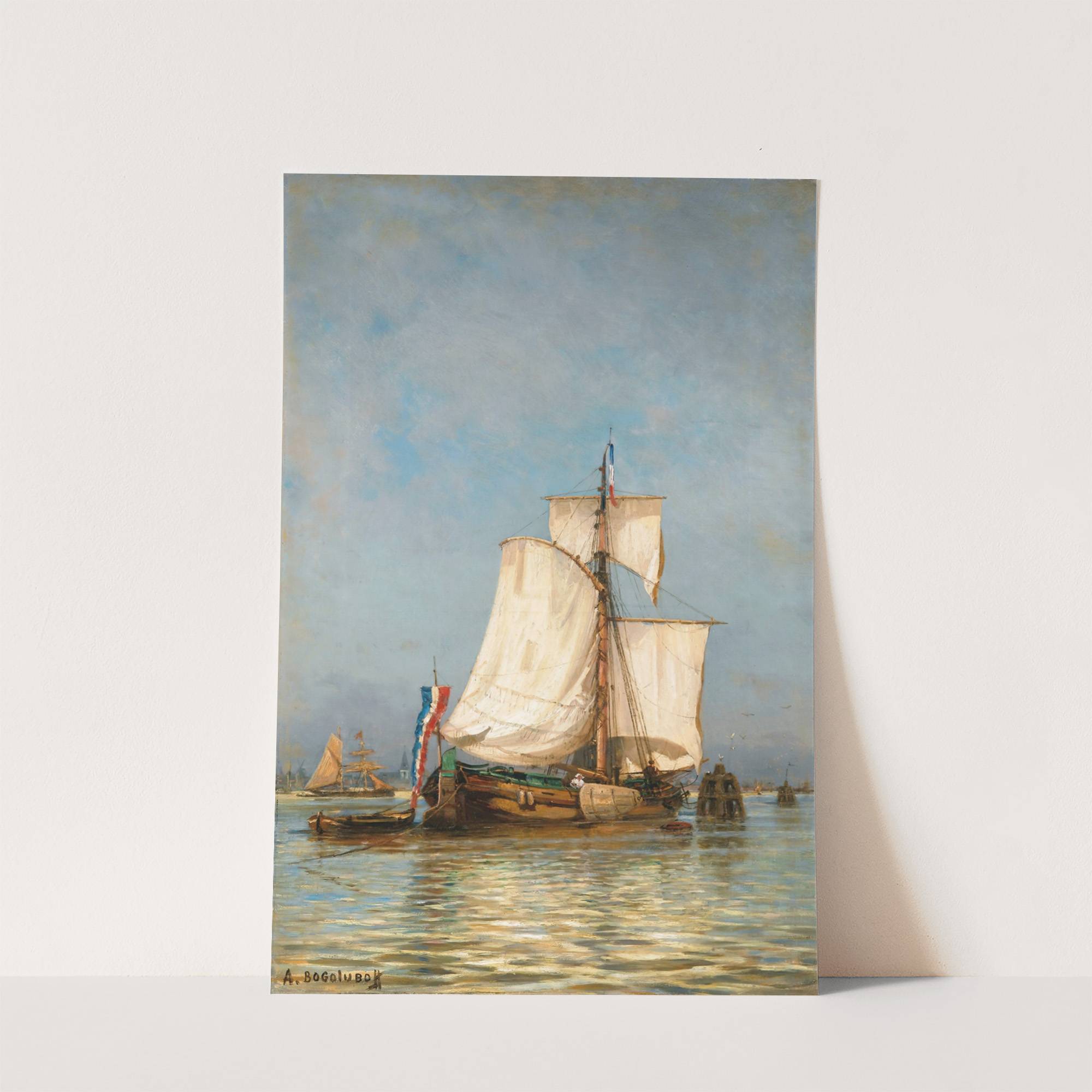 Discover the charm of classic maritime art with "Naples" by Alexey Petrovovich Bogolyubov. This vibrant oil painting captures a serene seaside scene featuring a majestic sailboat at anchor, its white sails gently billowing in the breeze. The vessel is adorned...