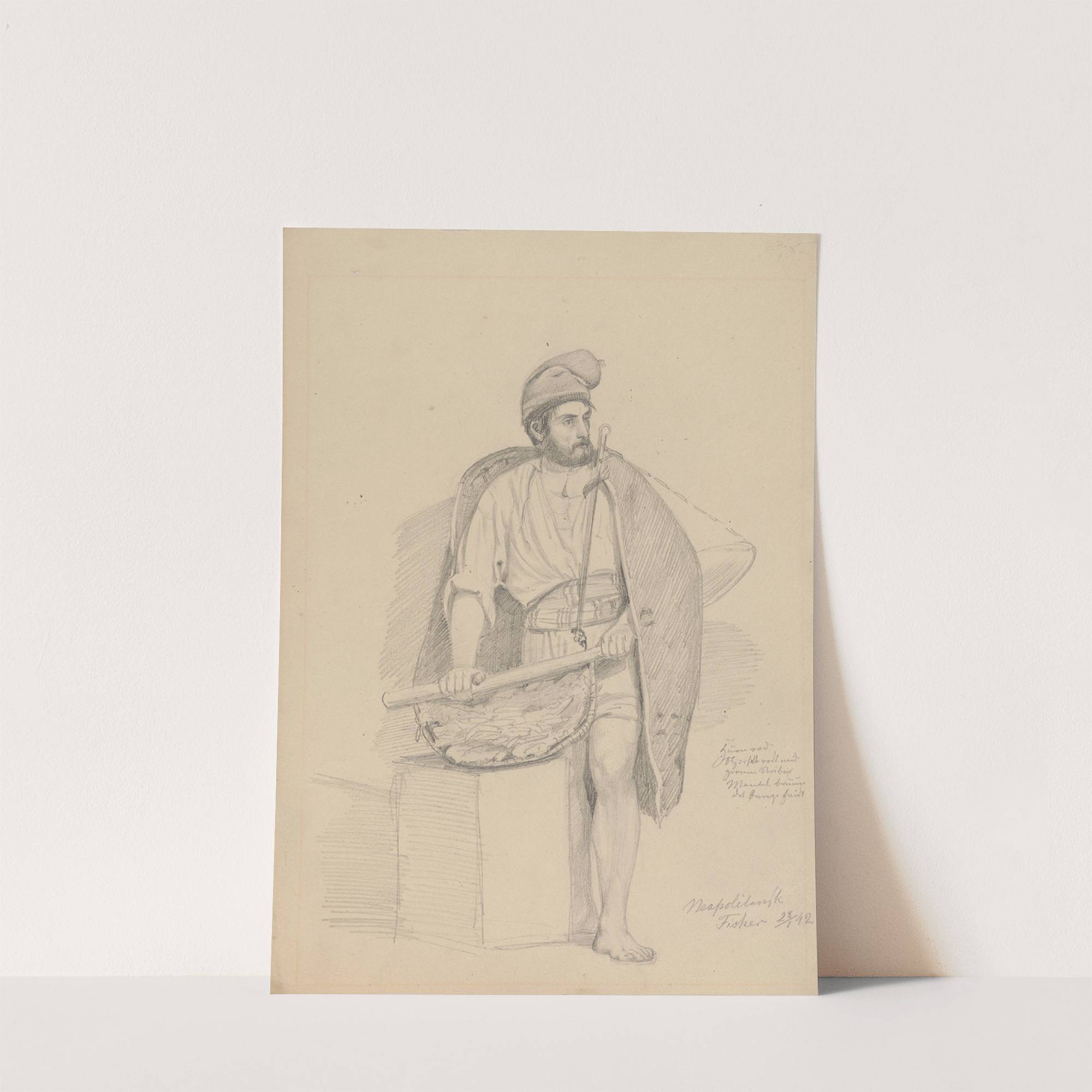This beautifully rendered pencil drawing by Adolph Tidemand depicts "Napolitansk fisker," a captivating study of a traditional fisherman from Naples. The subject is a bearded man with a solemn yet contemplative expression, sitting on a simple rectangular stone block. He...