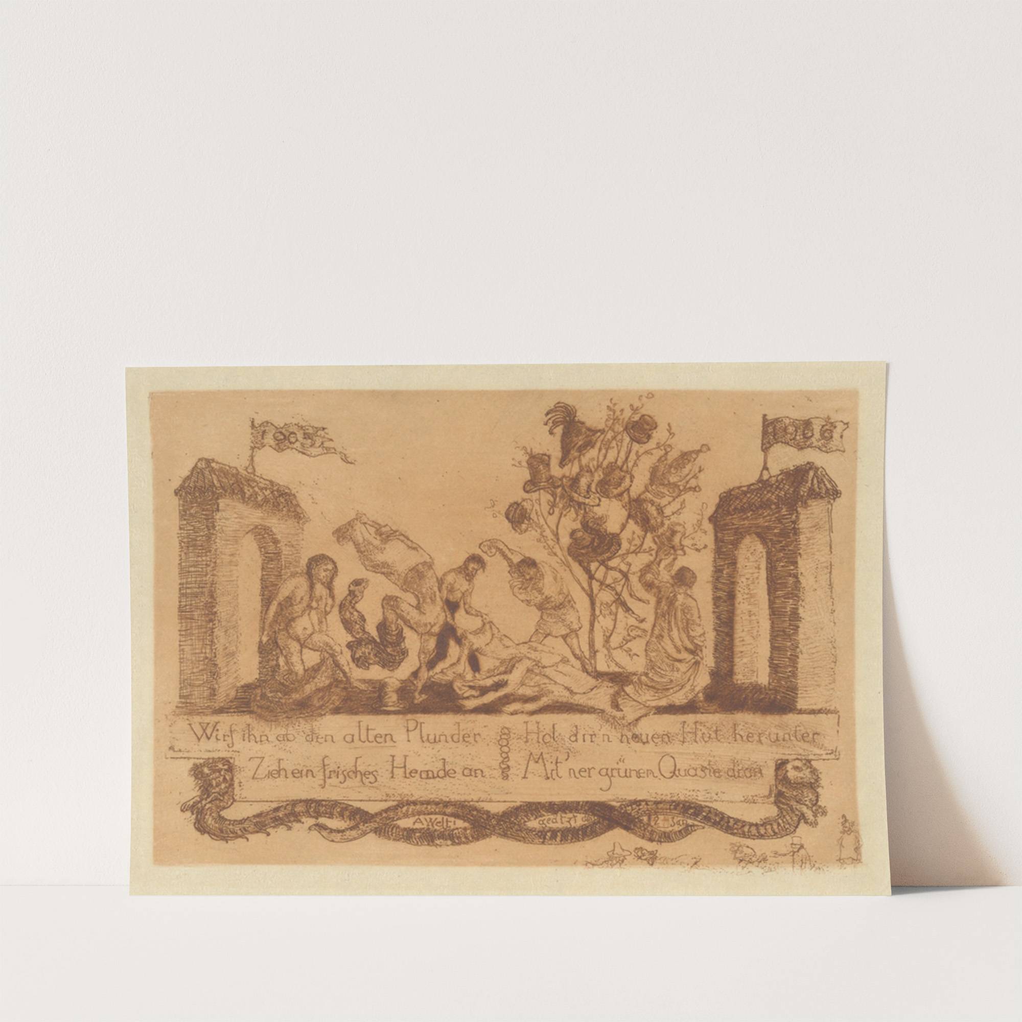 This artwork is "Neujahrskarte 1906" by Albert Welti, an exquisite example of traditional printmaking techniques. The piece features a series of delicate, brown-toned illustrations set against a cream background. Central to the composition are several human figures adorned in flowing...