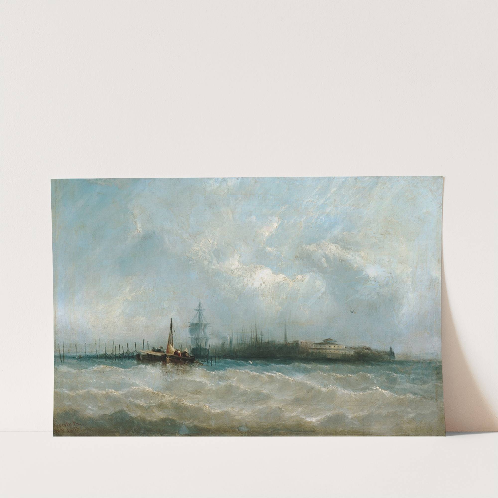 This painting captures a dynamic maritime scene titled "New York from the Harbor, Showing the Battery and Castle Garden" by Alfred Copestick. The artist employs a delicate yet expressive brush technique to convey the movement of the sea and the...