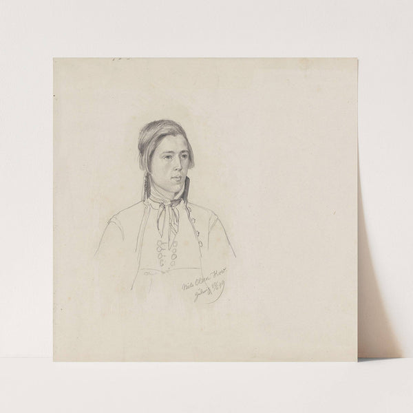 This monochrome pencil drawing features a meticulously detailed portrait of a woman from the shoulders up. Rendered with delicate line work, her gentle facial expression is captured with precision, showcasing subtle emotions. She has straight, shoulder-length hair that frames her...