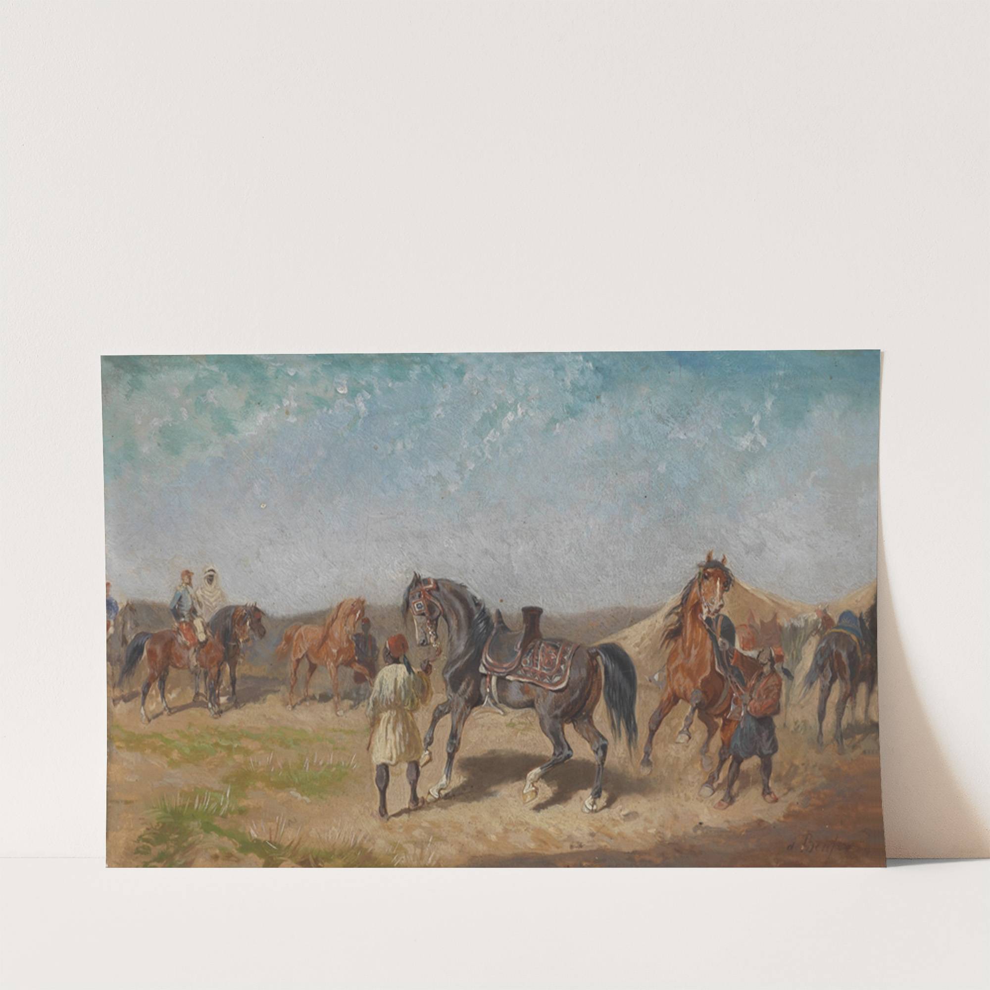 "Experience the timeless beauty of history with this captivating art print titled 'Nordafrikanisches Reiterlager' by Alexander Von Bensa. This exquisite painting depicts a group of horsemen gathered in an open, grassy landscape under a vivid blue sky filled with gentle...