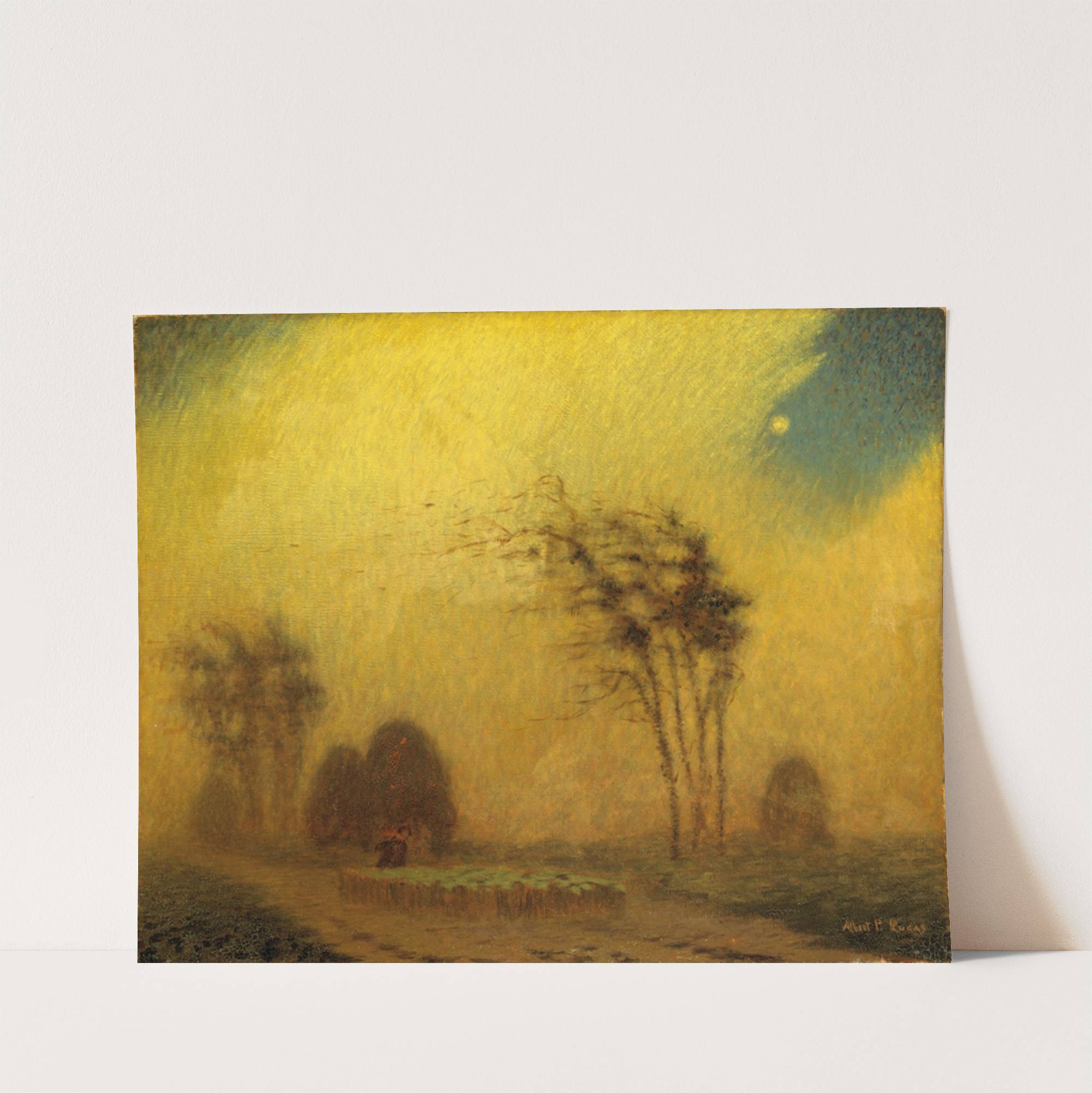 This stunning impressionistic painting by Albert Pike Lucas is titled "October Breezes." It beautifully captures the essence of an autumn landscape bathed in warm, golden light. The upper section of the painting is dominated by a glowing yellow sky that...