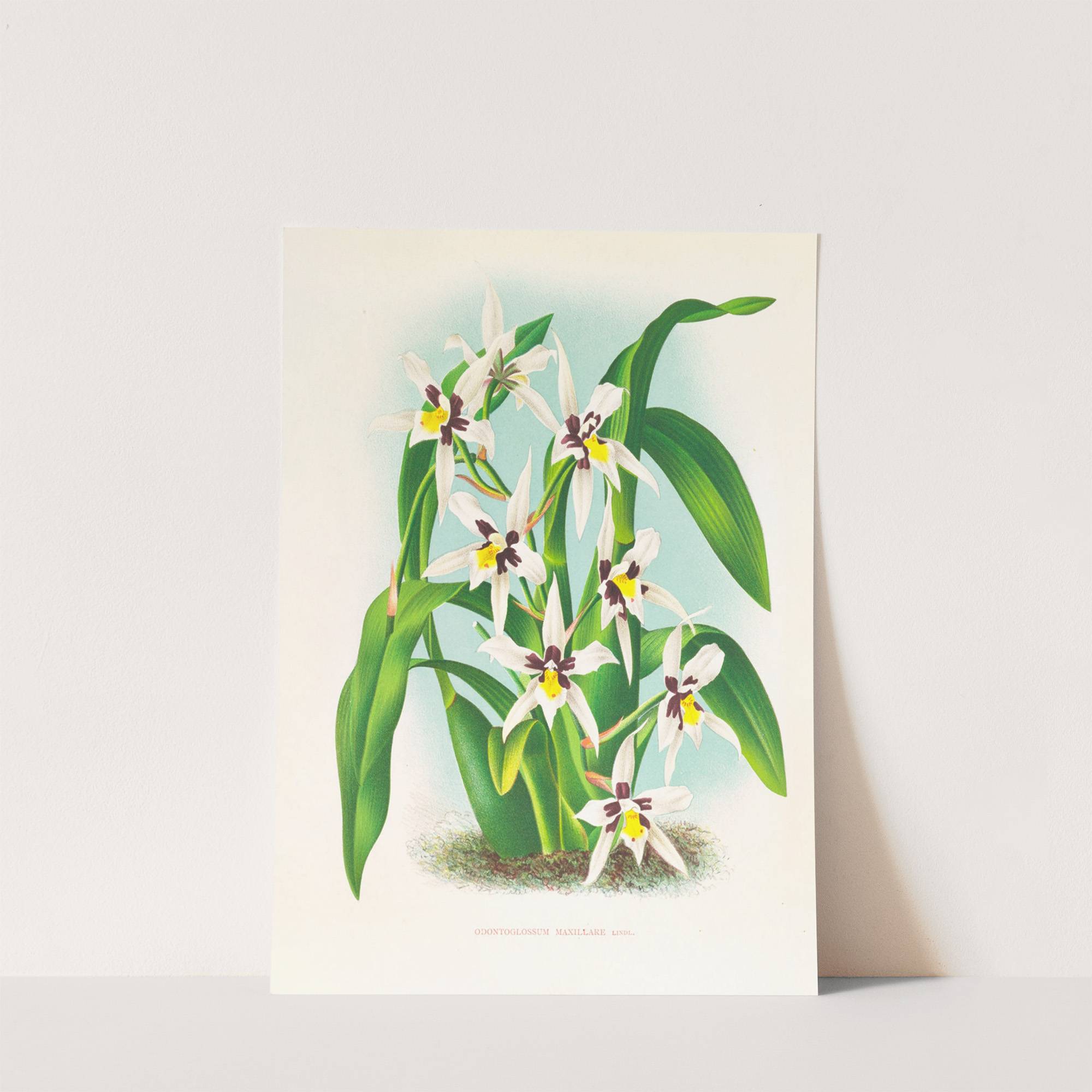 This vibrant art print features "Odontoglossum maxillare" by Jean Jules Linden, showcasing an exquisite floral arrangement. The painting captures delicate white orchids adorned with striking yellow and purple markings at their centers, nestled among lush green leaves. Each flower is...
