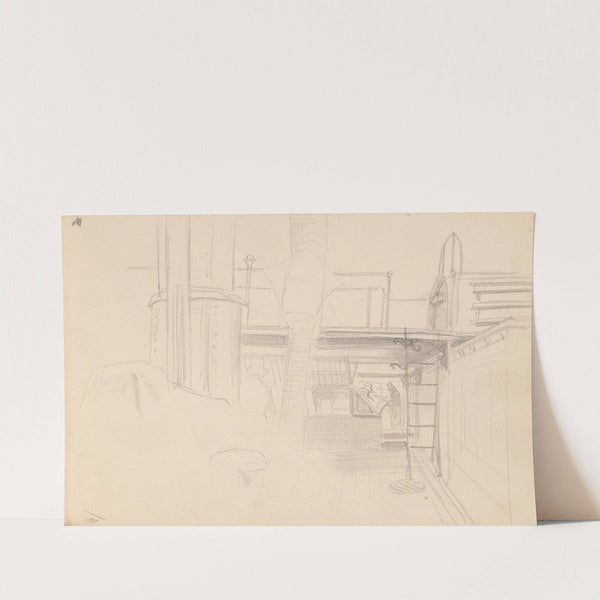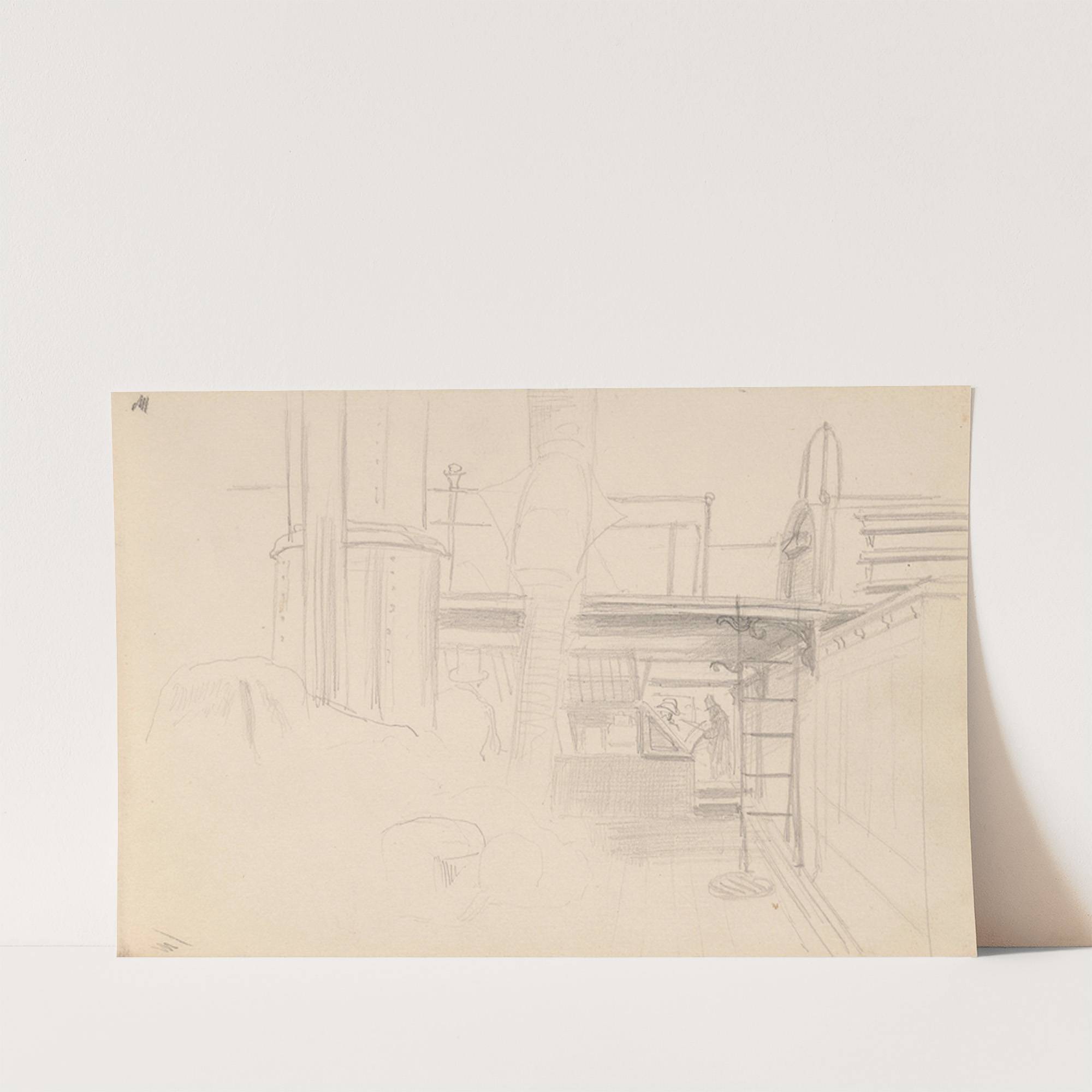 This artwork, titled "On the ship's deck" by Adolph Tidemand, is a delicate monochrome pencil sketch that captures the subtle ambiance of a maritime scene. The image features lightly rendered structural elements including vertical lines suggesting tall ship masts and...