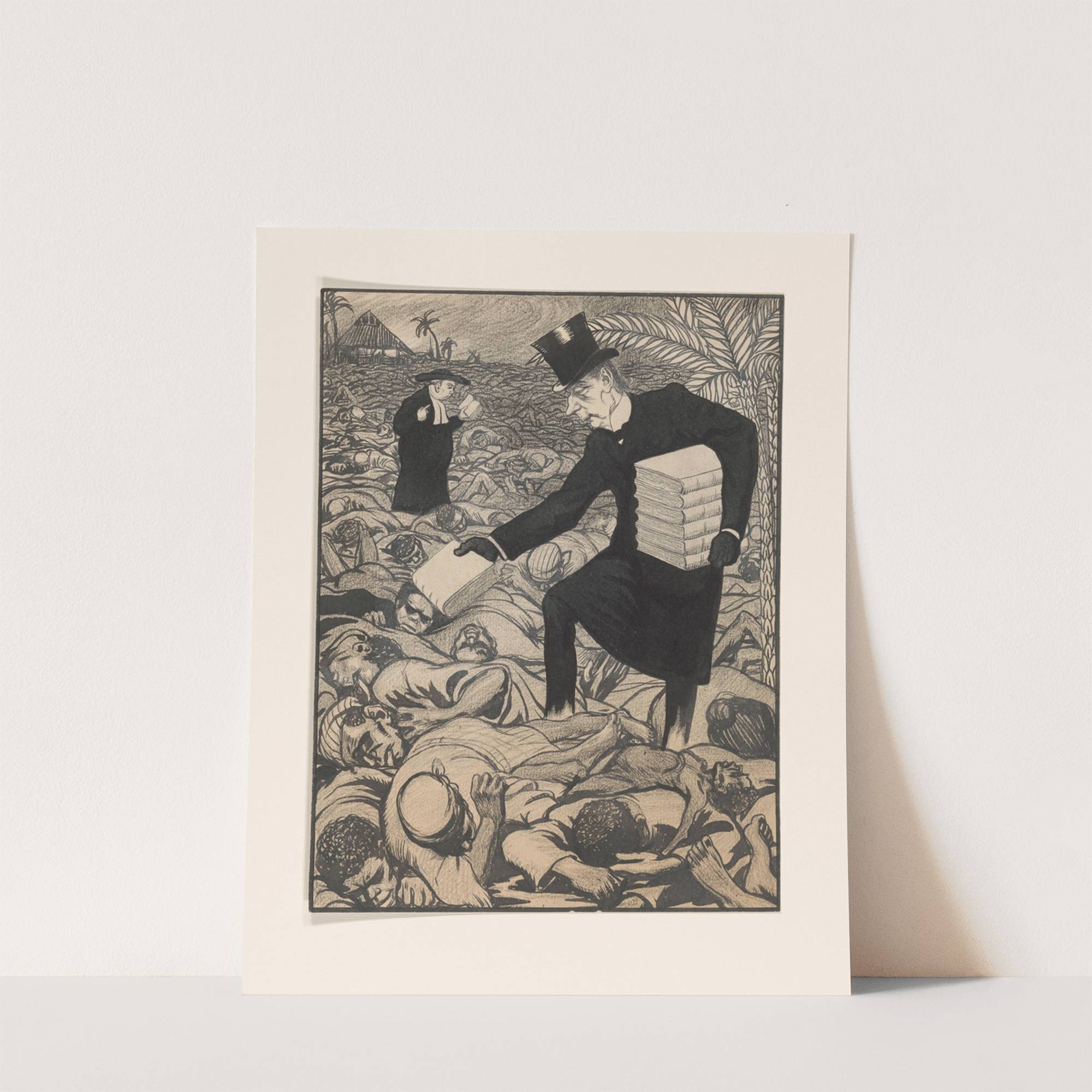 This striking print features "Ontwerp voor een politieke spotprent op zendingswerk" by Albert Hahn, capturing a powerful social commentary with detailed, monochromatic line work. The central figure, dressed in a formal black suit and top hat, carries a large stack...