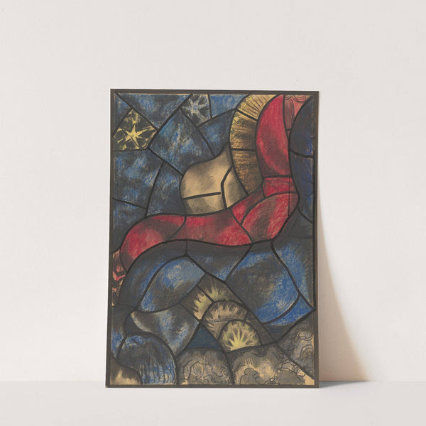 This vibrant stained glass art print features a richly colored abstract design, perfect for adding a touch of elegance to any space. The piece showcases bold segments of deep blue and red, which are expertly outlined with black lead caming...