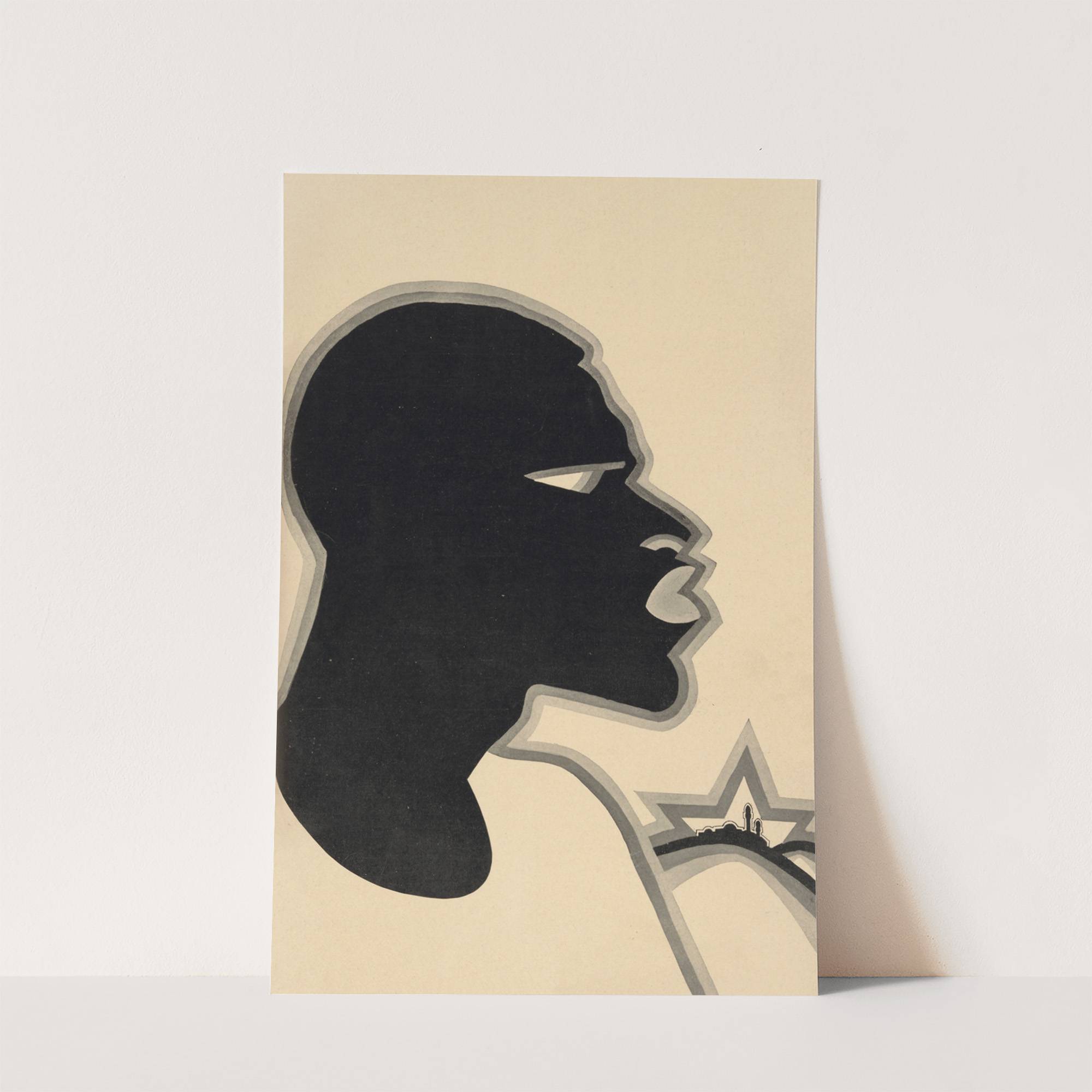 Introducing "Opportunity Vol. 3, No. 36 Cover" by Aaron Douglas, a striking piece of modern art that showcases powerful symbolism and minimalist design. This artwork features a bold, black silhouette of a man's profile in strong side profile view against...