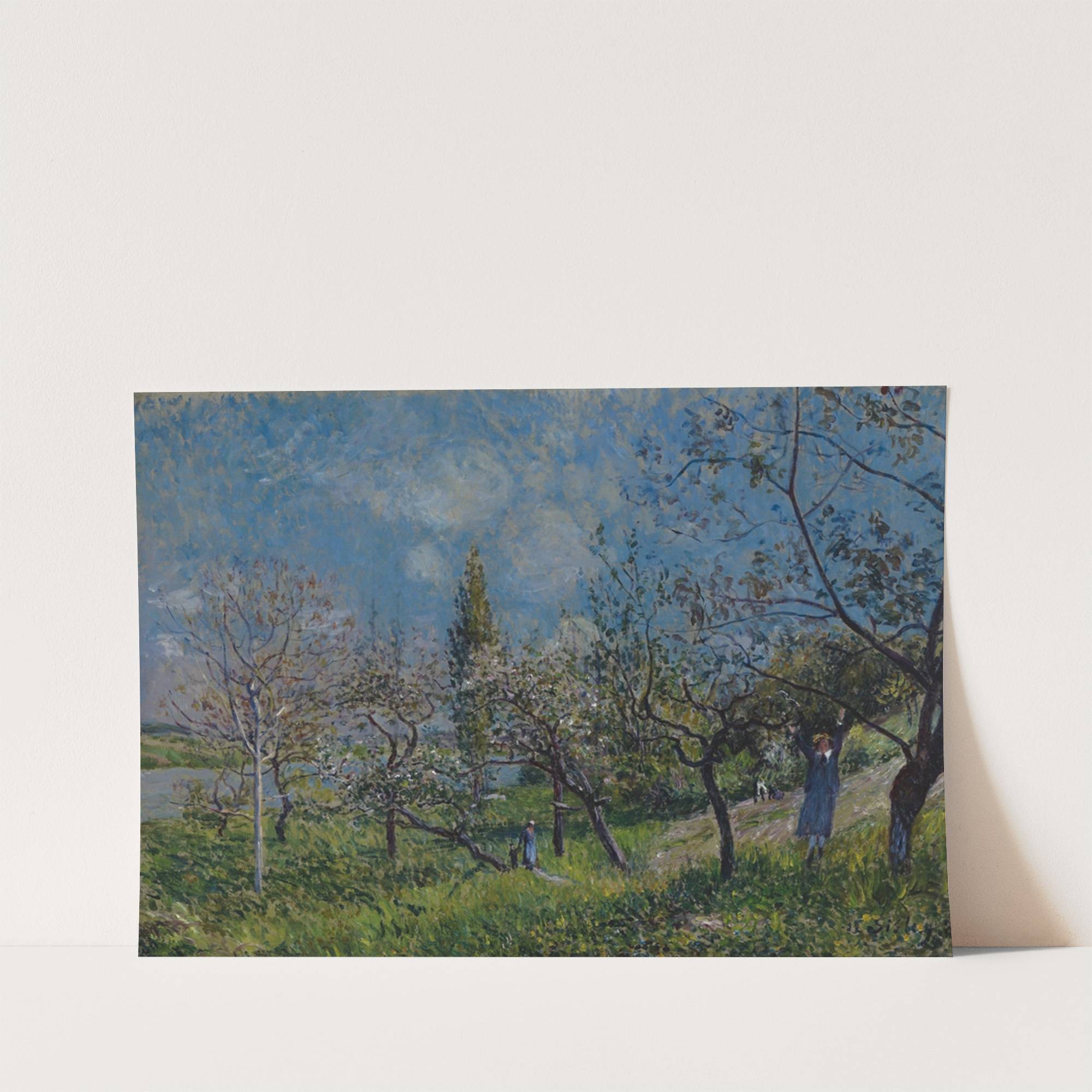This vibrant art print, "Orchard in Spring" by Alfred Sisley, showcases a serene springtime scene with vivid colors and fine details. The landscape features tall, leafless trees interspersed with blossoming ones, creating an interplay of shadow and light. Soft blues...