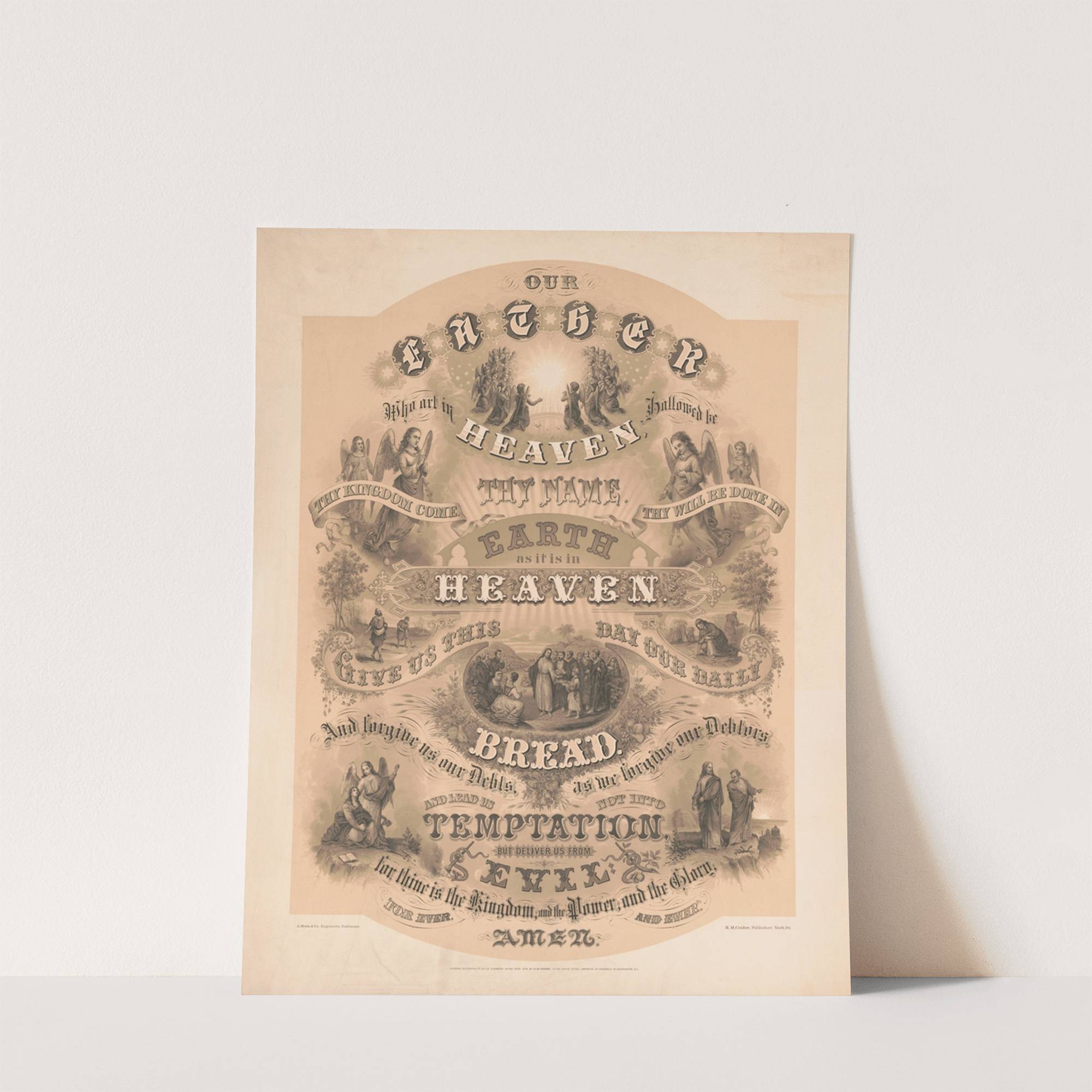This vintage-style art print features an intricate illustration of the biblical phrase "Our Father who art in heaven," rendered in sepia tones with expert detailing. The central focus is a large, ornate lettering that reads "HEAVEN" prominently. Surrounding this central...