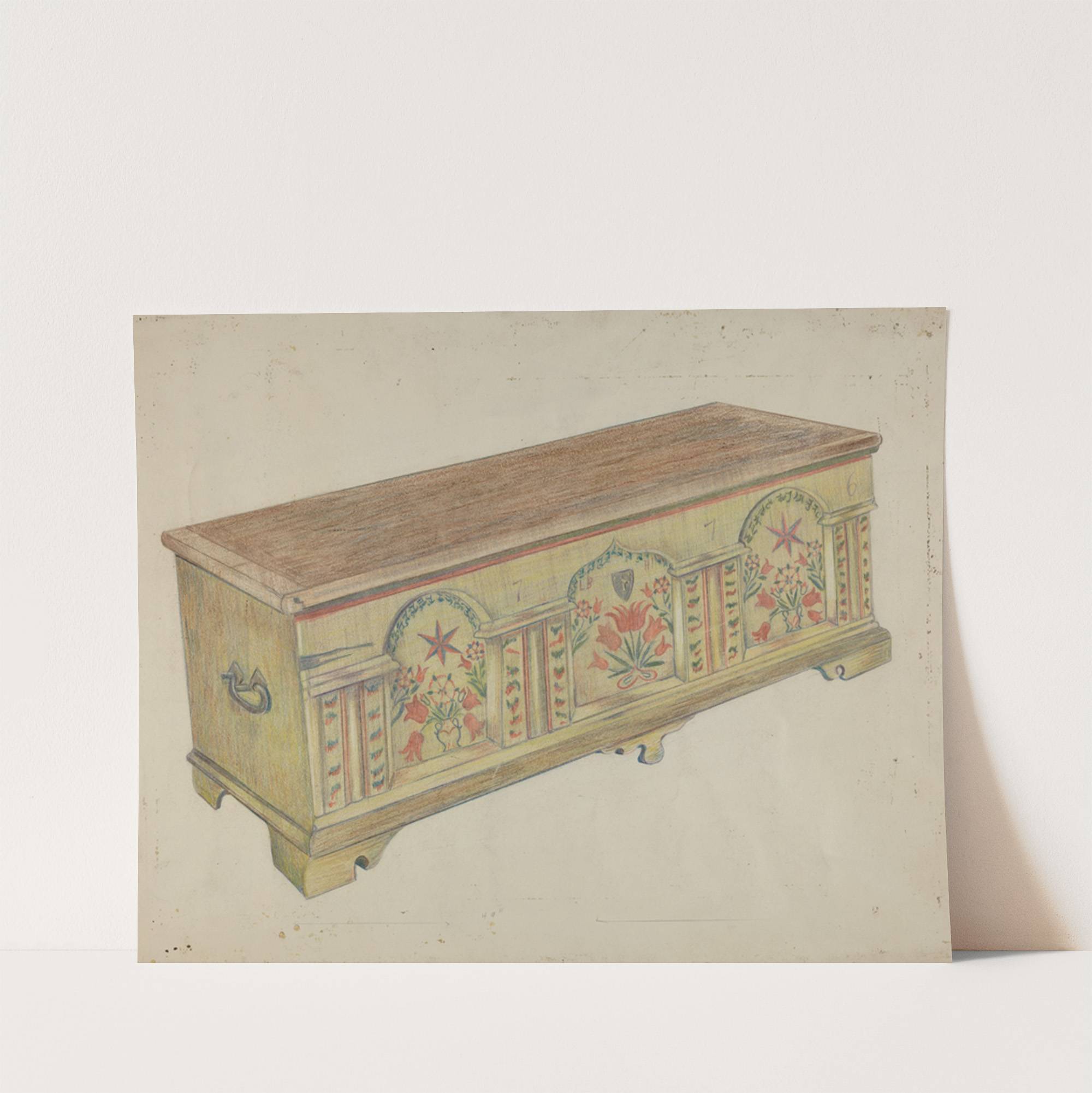 This elegant piece is titled "Pa. German Chest" by the artist of American 20th Century Art. The artwork features a beautifully detailed chest with classic German influences, rendered in a warm, pastel color palette. The chest's rectangular body is adorned...