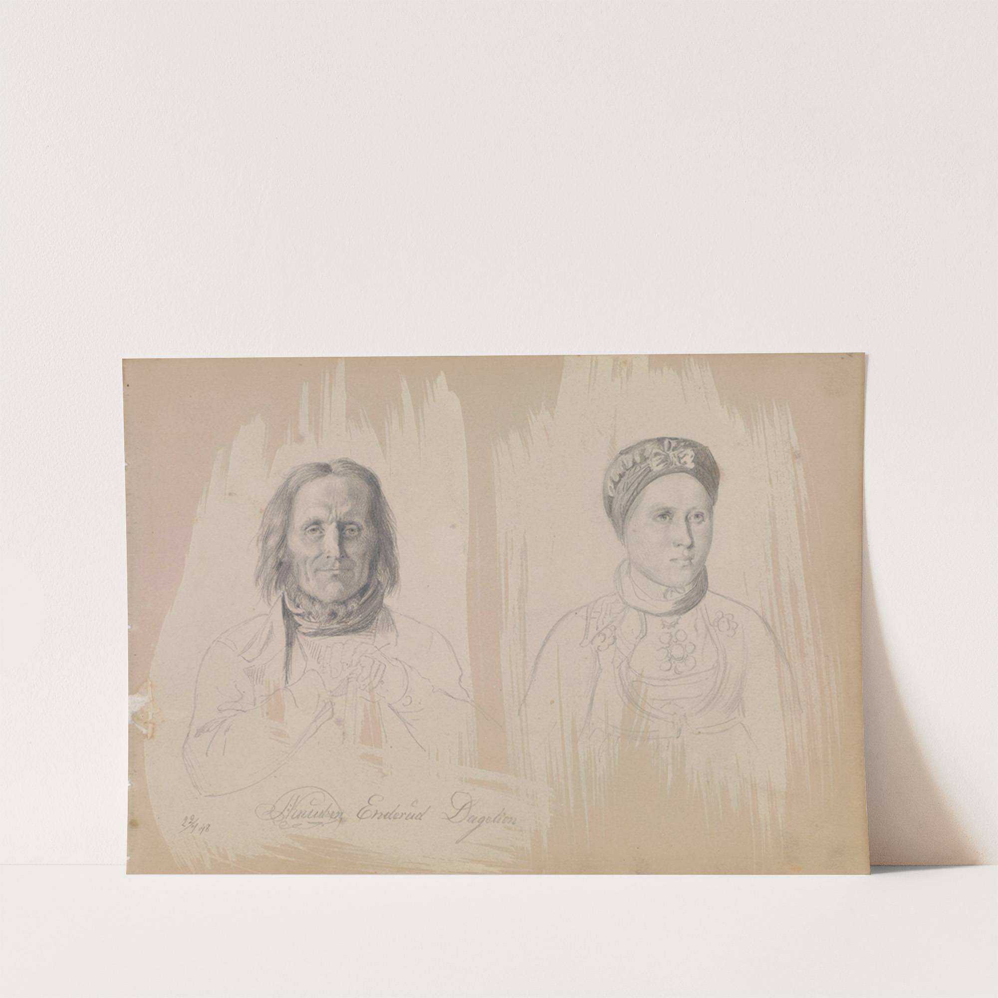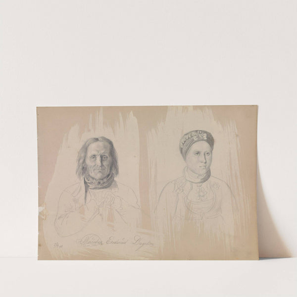 This art print features two meticulously drawn pencil sketches of historical figures by Norwegian artist Pål Knutsen Enderud. On the left is a detailed portrait of an elderly man with long, wavy hair and a solemn expression, wearing a high-collared...