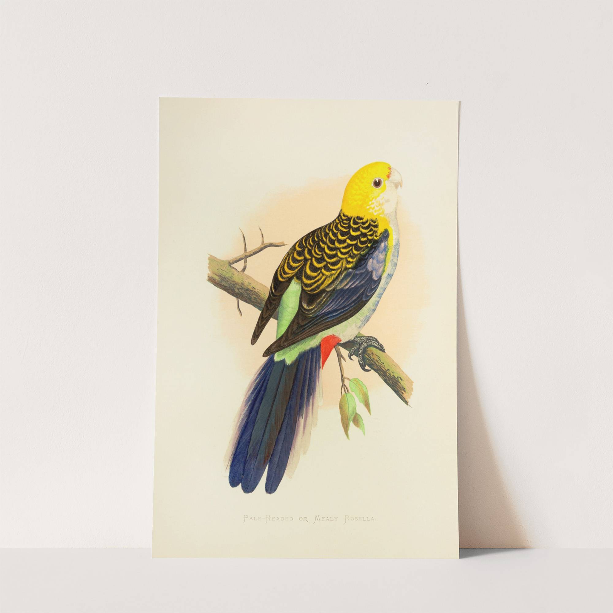 This vibrant art print features a stunning illustration of a pale-headed mealy rosella bird, meticulously captured in a detailed watercolor style. The bird's head is a bright, sunny yellow, standing out against its multi-colored plumage. Its back and wings showcase...
