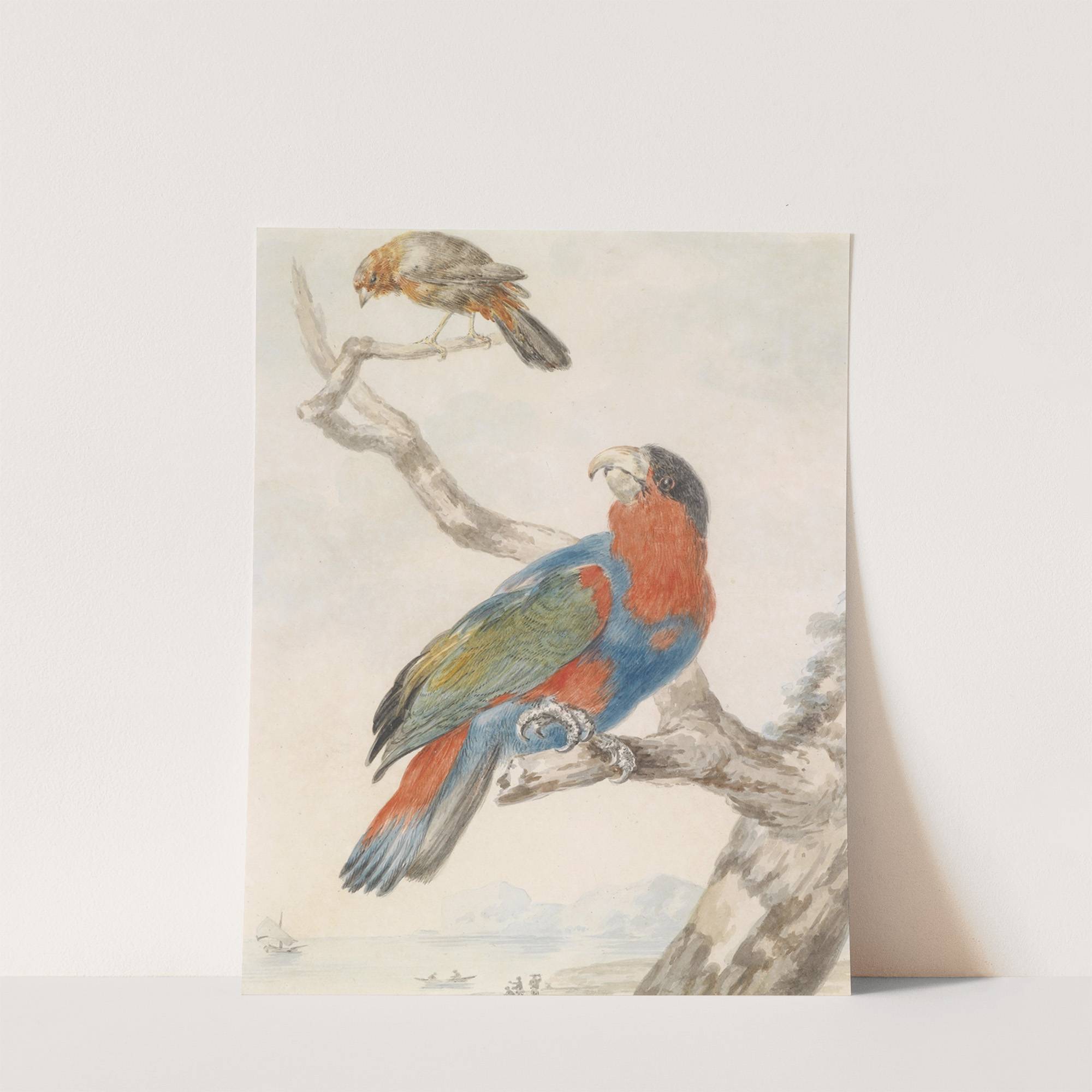This exquisite print features "Papagei" by the artist Abraham Meertens, showcasing a vibrant and detailed depiction of two parakeets perched on a twisted branch. The foreground bird is a strikingly vivid parakeet with a rich mix of colors: its head...