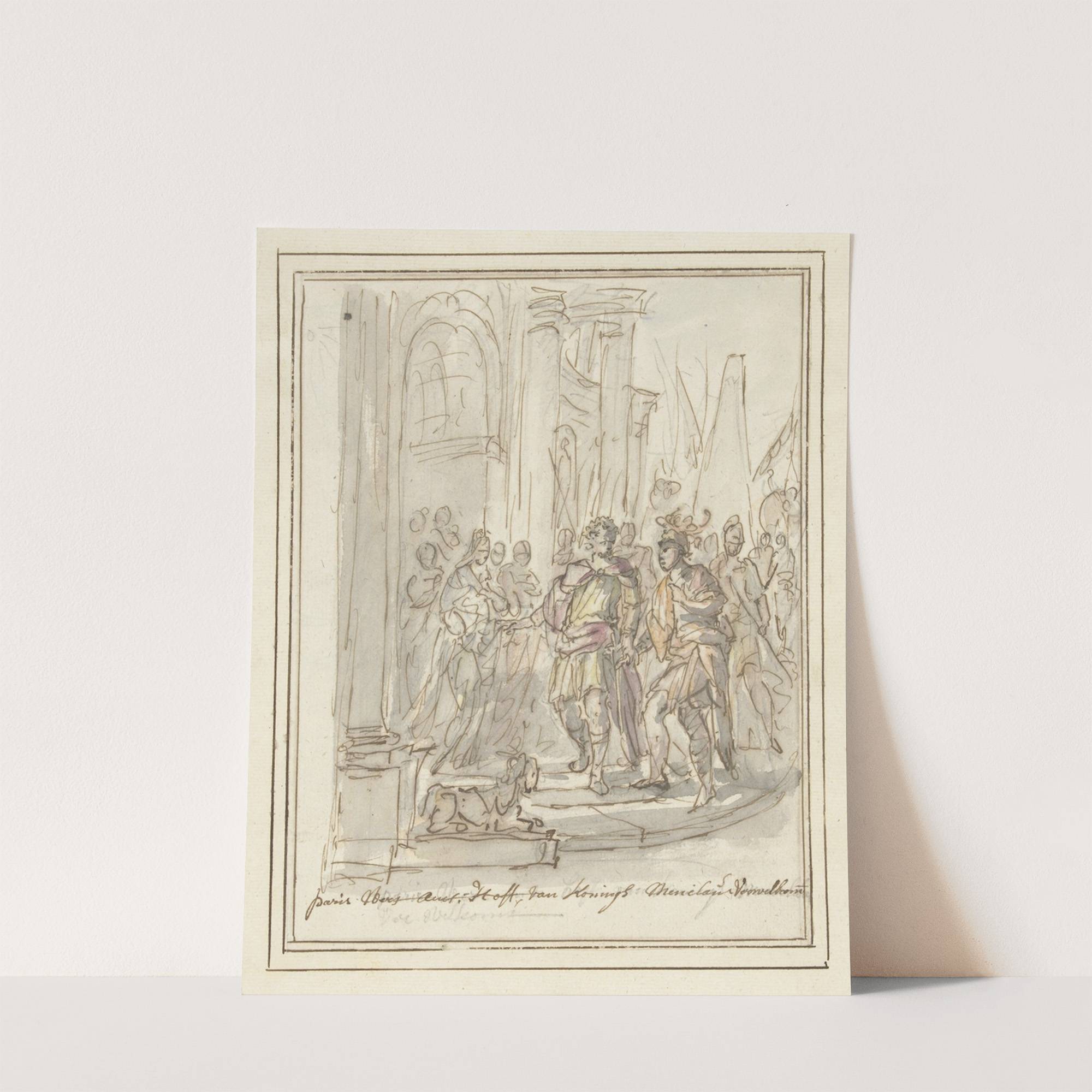 This art print features a detailed pencil sketch of "Paris welcomed at the court of Menelaus," created by artist Elias van Nijmegen in 1677. The scene is filled with dynamic movement, as Paris is greeted warmly by several figures dressed...