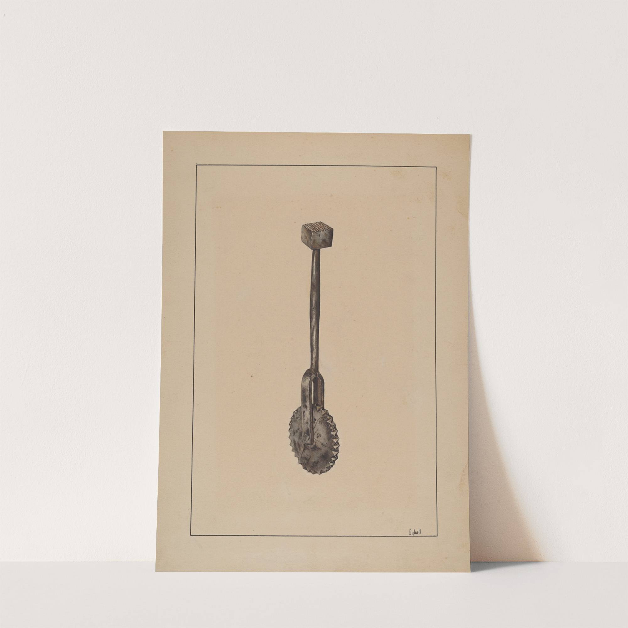 This artwork showcases "Pastry Jagger" by Adelaide Dyball, presented in a minimalist style. The piece features a detailed drawing of an old-fashioned pastry scraper, which hangs centrally against a light beige background. The scraper's handle is short and rectangular, leading...