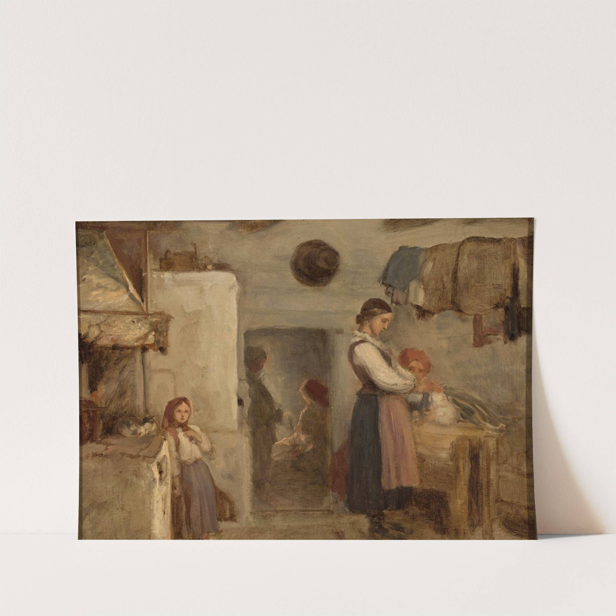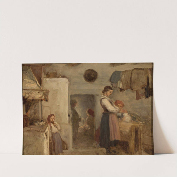 This captivating artwork by Aleksander Kotsis beautifully captures the rustic charm of a peasant cottage interior. The painting features three women, each engaged in different activities within this cozy, lived-in space.In the foreground to the right, a woman with dark...