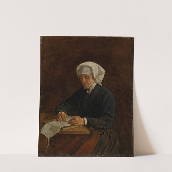 This artwork captures a serene moment featuring "Peasant Woman from Vikøy" painted by Adolph Tidemand in 1873. The subject is a peasant woman dressed in traditional attire, seated against a dark brown backdrop that provides contrast to her figure. She...