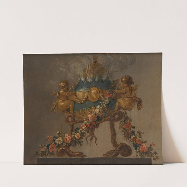 Perfume-burner supported by amorini and serpents and garlanded with flowers by David Hartmann - Wall Art Print