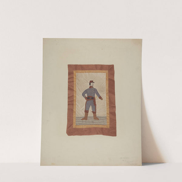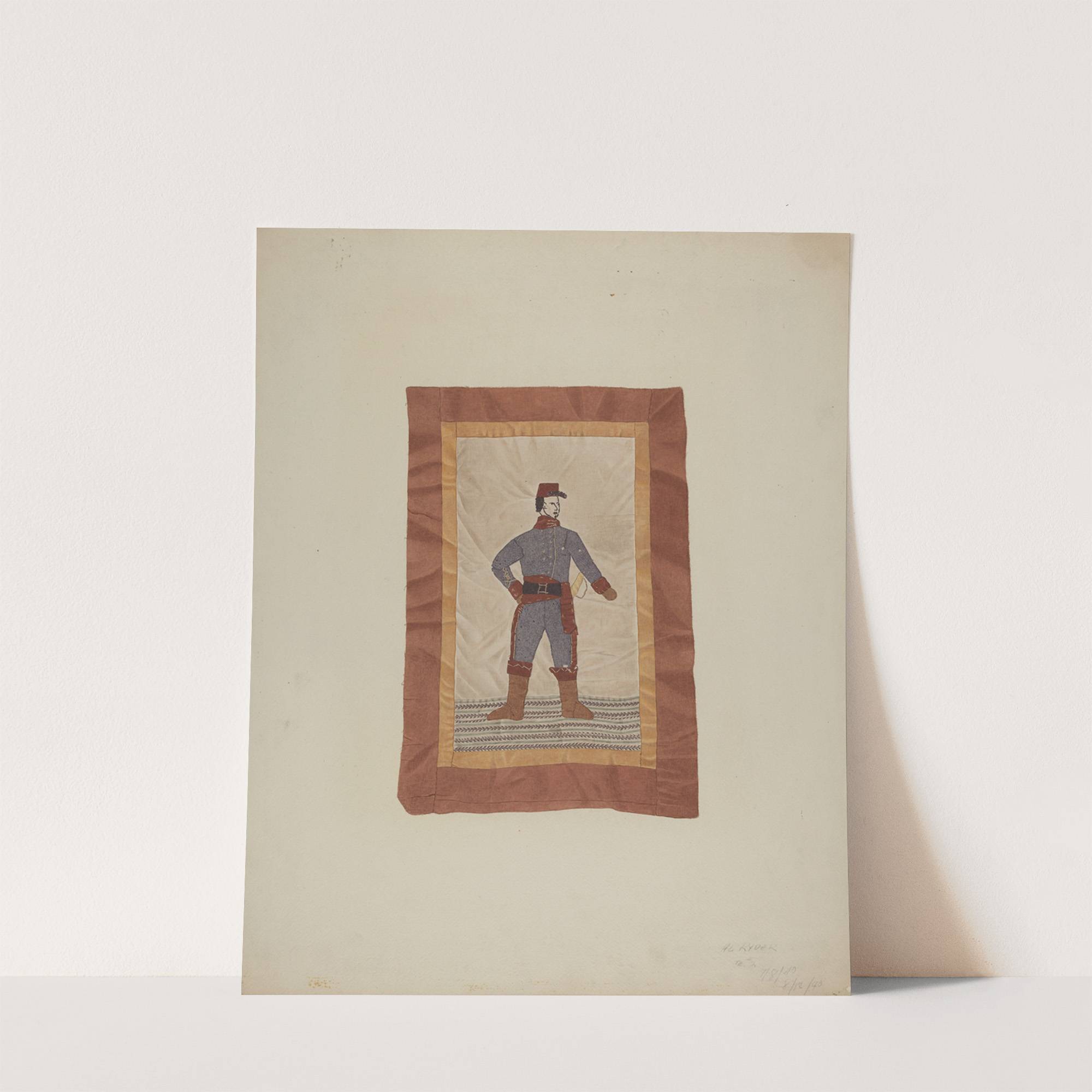 This art print features "Pillow Top Insert" by the renowned artist Albert Ryder. The piece showcases a stylized quilt patch design that highlights a standing figure at its center. The figure is depicted in muted blue with detailed red accents,...
