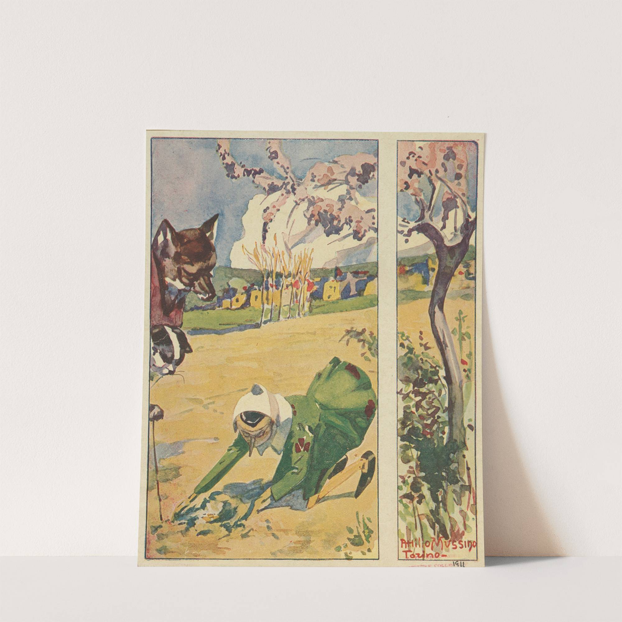 Pinocchio finds the fox and the cat again, and goes with them to sow the gold pieces in the Field of Wonders. by Attilio Mussino - Wall Art Print