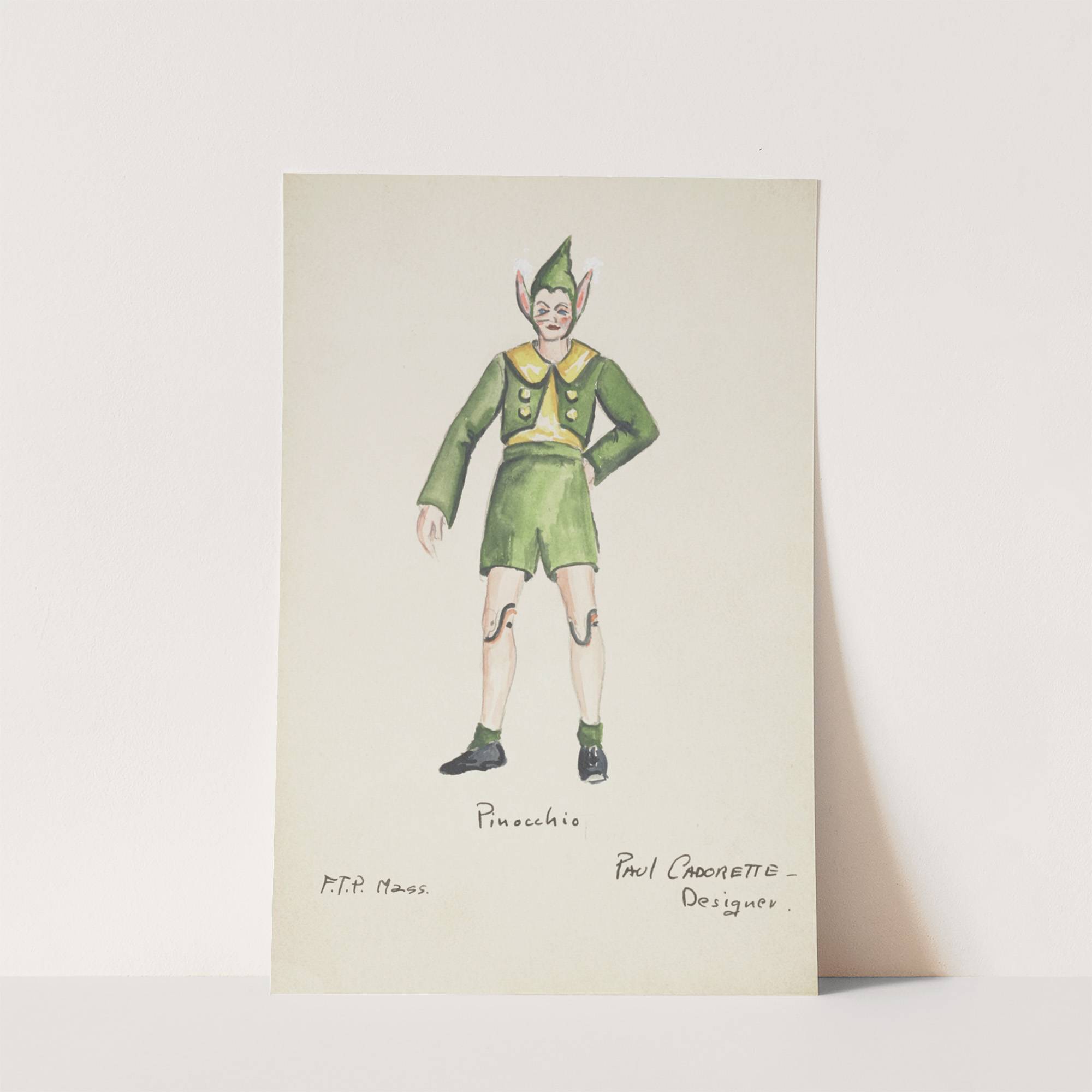Pinocchio: Yellow shirt, green coat, green shorts, and green cap with velvet ears (1934-1943) by Paul Cadorette - Wall Art Print
