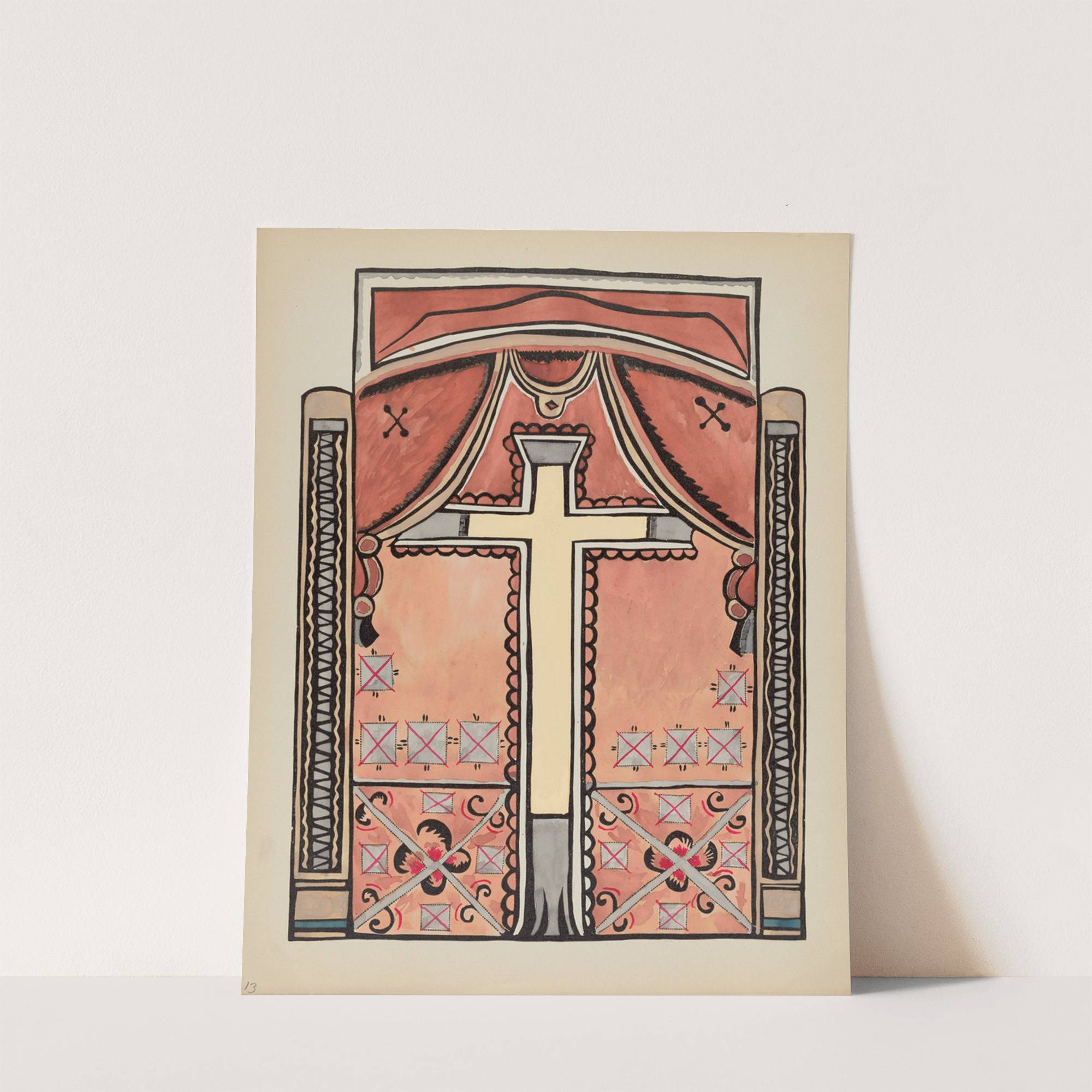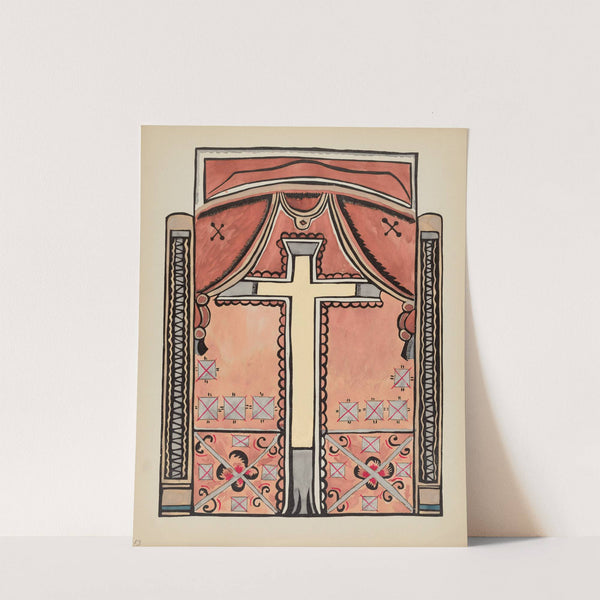 This art print features a stylized representation of an ornate cross, set within a decorative architectural frame reminiscent of Spanish colonial designs from New Mexico. The central cross is prominently displayed in the center of the composition, rendered in white...