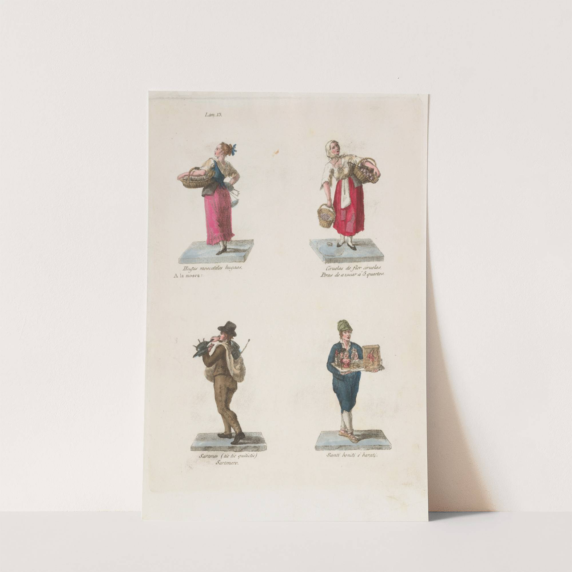 Plate 13; four street vendors from Madrid selling muscat grapes, plums, pans and pop-up saints (1809–1817) by Miguel Gamborino - Wall Art Print