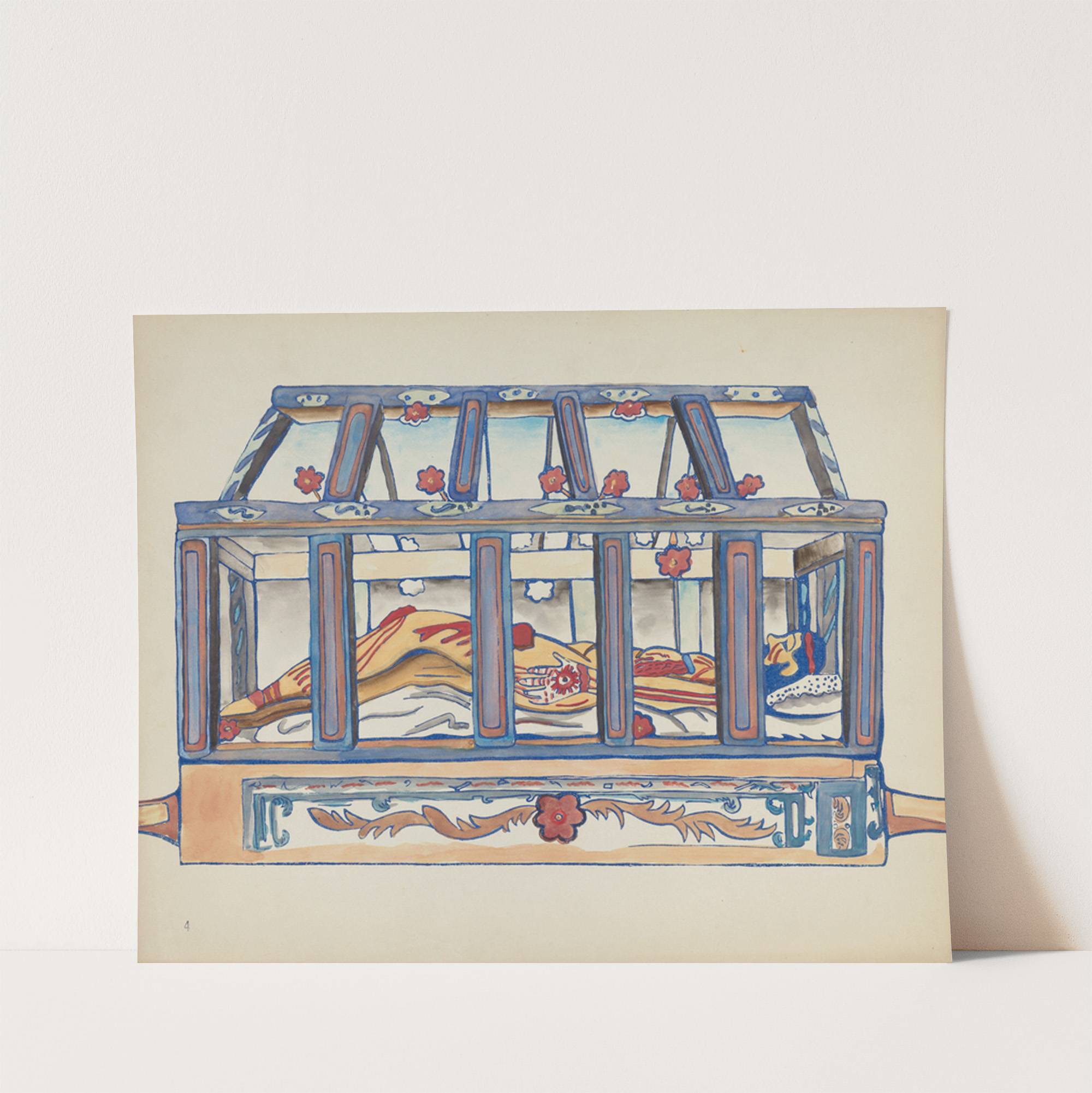 This vibrant art print features "Plate 4 – Christ in the Sepulchre" from the "Spanish Colonial Designs of New Mexico" series. The artwork showcases a detailed illustration of Christ's tomb, rendered in a colorful, almost folk-art style. The focal point...