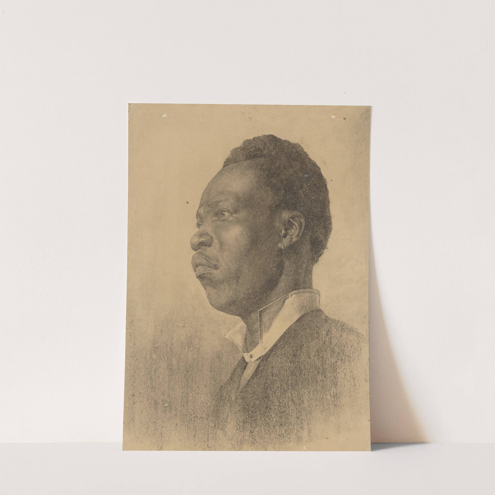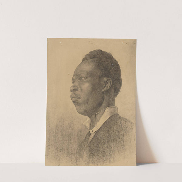 This monochromatic portrait is titled "Podobizeň černošského chlapce" by artist Ákos Aranyossy. The artwork features a finely detailed, grayscale sketch of an African man with dark skin and short, curly hair. He gazes thoughtfully to the right, exuding a sense...