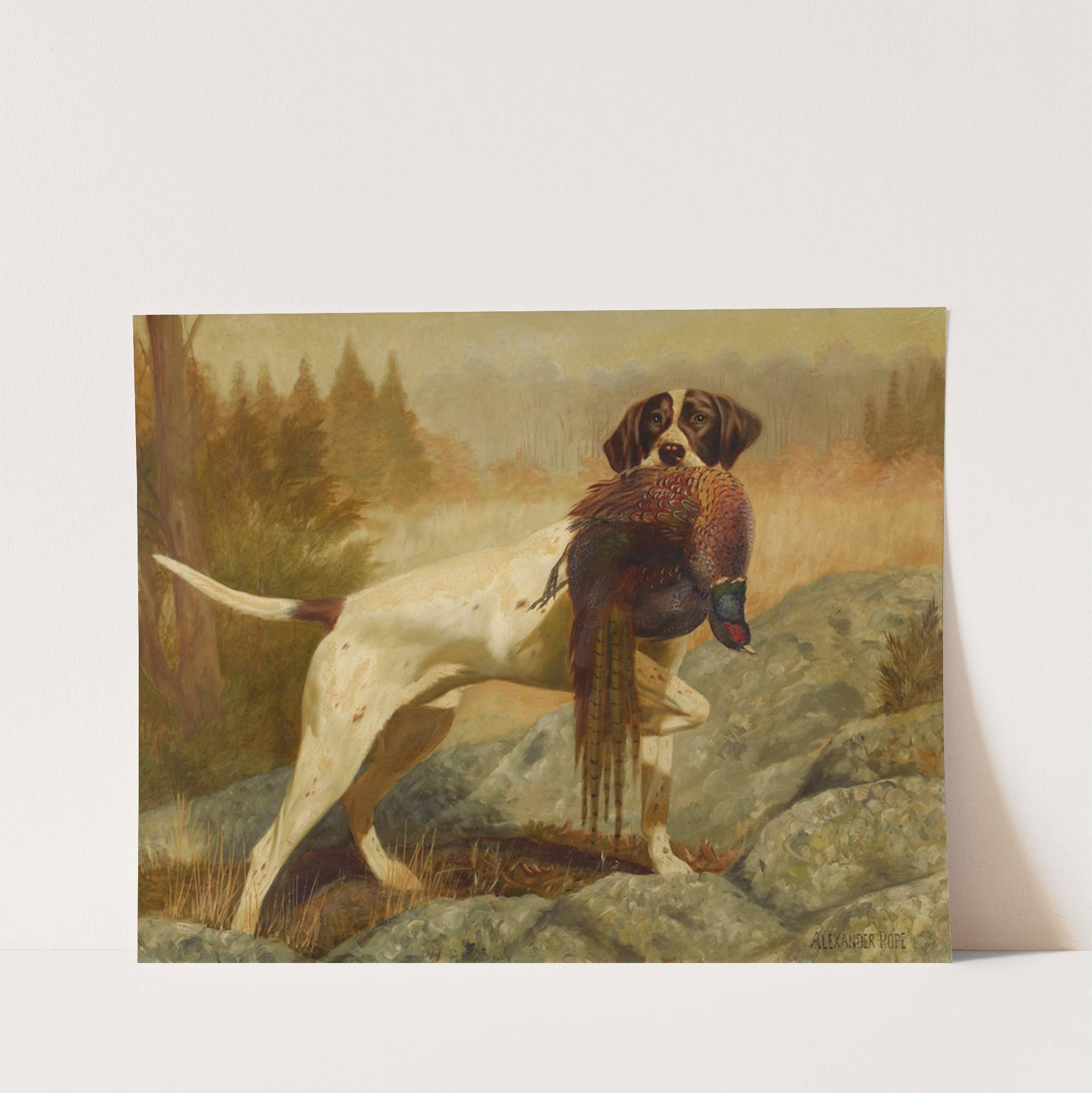 This stunning art print showcases "Pointer with Pheasant" by renowned artist Alexander Pope Jr. The painting features an elegant pointer dog, with a white coat speckled with brown spots, standing proudly in a rugged, natural landscape. The dog holds a...