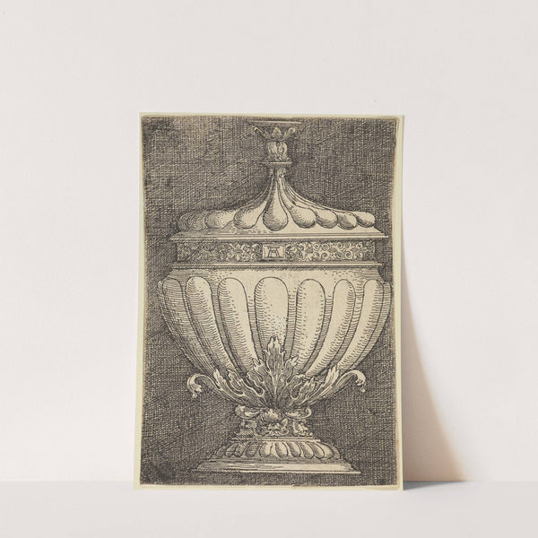 This exquisite art print features "Pokal, mit eiförmigem Körper" by Albrecht Altdorfer, a masterful example of Renaissance-era engraving. The piece showcases an intricately detailed urn with a classical, elegant design. The urn has a wide, fluted body that tapers slightly...