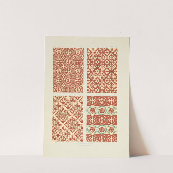 This elegant art print features four distinct patterns inspired by medieval designs, each meticulously crafted with rich red and white tones. The top left panel showcases a circular motif pattern, reminiscent of intricate lacework, with symmetrical floral and geometric elements....
